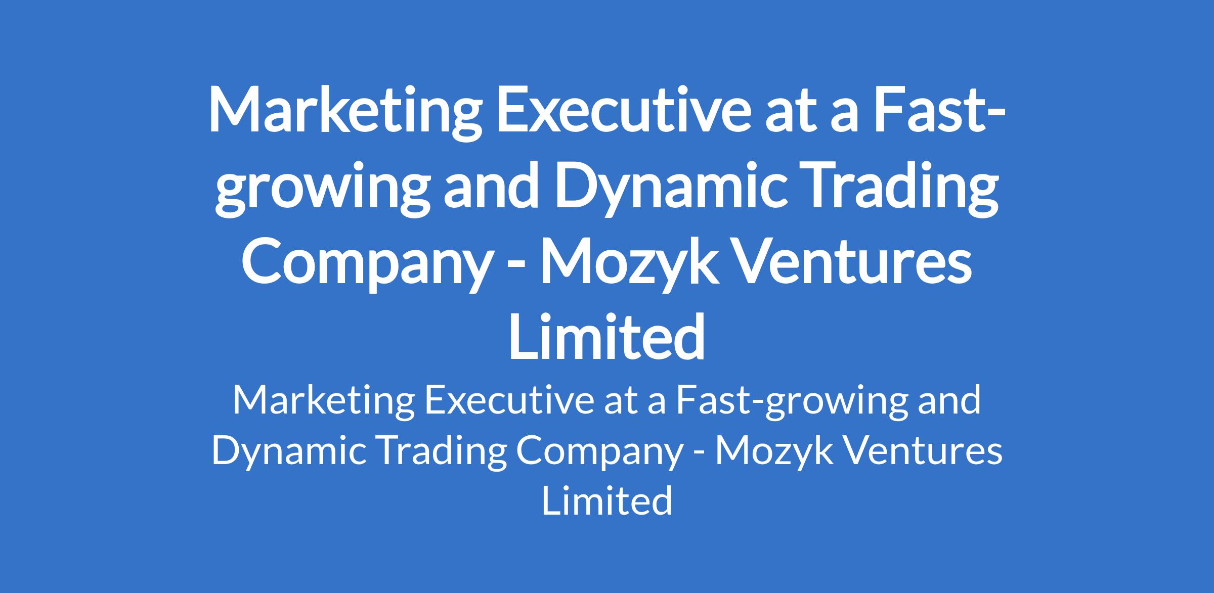 Mozyk Ventures Limited - Our client, a Fast-growing and Dynamic Trading company is recruiting to fill the position of: Marketing Executive. The position is located in Lagos State. Interested candidates should possess an HND / BS.cin Marketing or related discipline with at least two years experience, must be computer literate and should not be more than 35 years old.