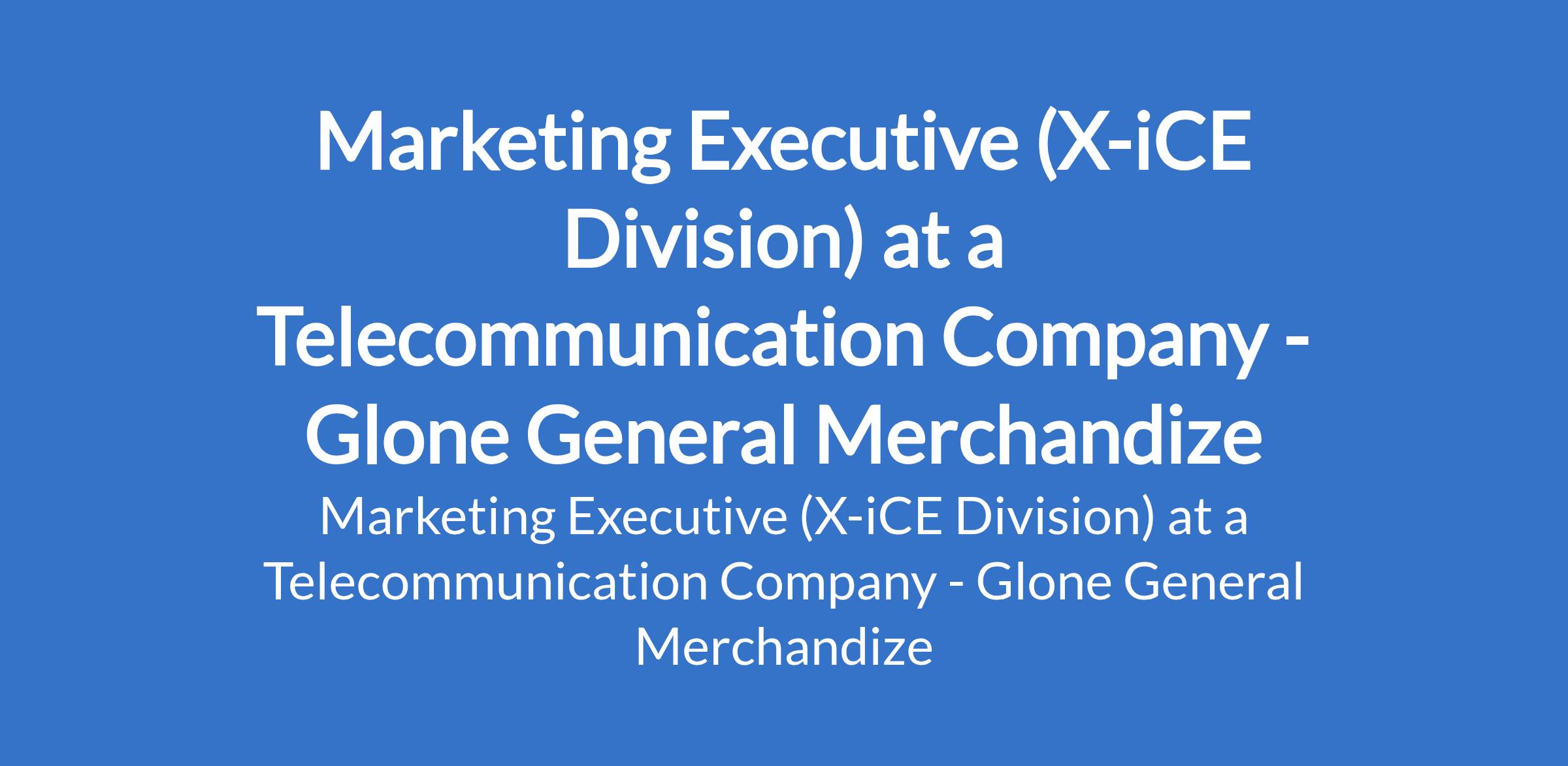 Glone General Merchandize - Our client, a telecommunications company is recruiting to fill the position of: Marketing Executive (X-iCE Division). The position is located in Lagos State. Interested candidates should possess a Degree in Marketing, Business, or Mass Communication with a minimum 2 years marketing experience (electronics / FMCG preferred).