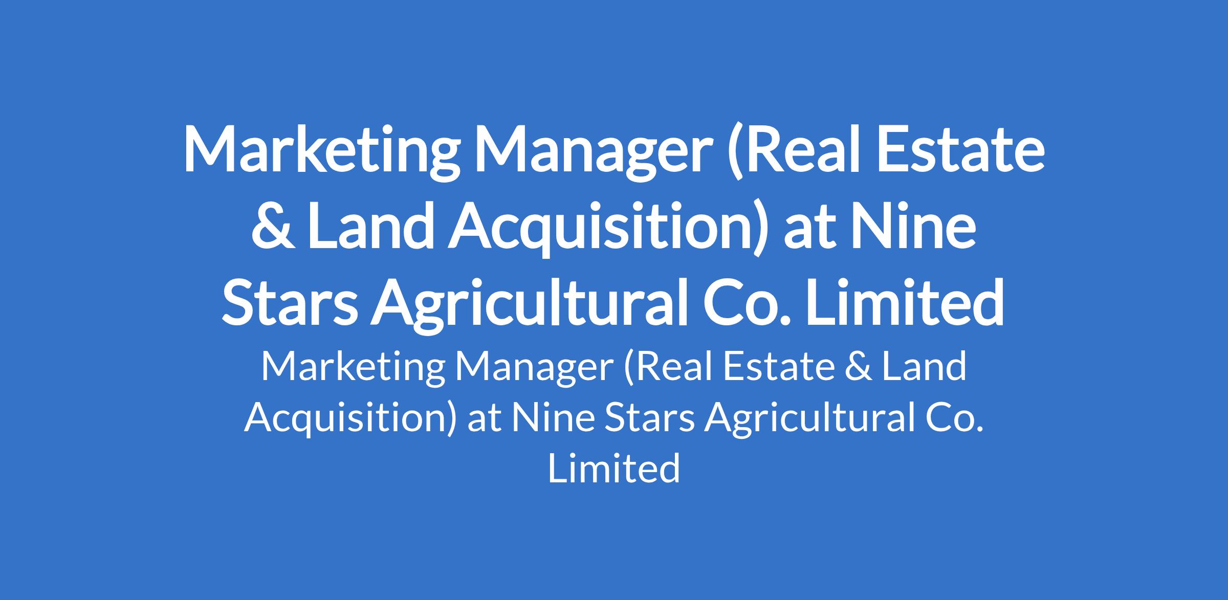 Nine Stars Agricultural Co. Limited is recruiting to fill the position of: Marketing Manager (Real Estate & Land Acquisition). The position is located in Ode-Remo, Ogun State. Salary: N350,000 - N700,000 monthly. Interested candidates should possess a Bachelors Degree in Marketing, Business Administration, Estate Management, or a related field with 710 years experience in marketing, with a strong focus on real estate.