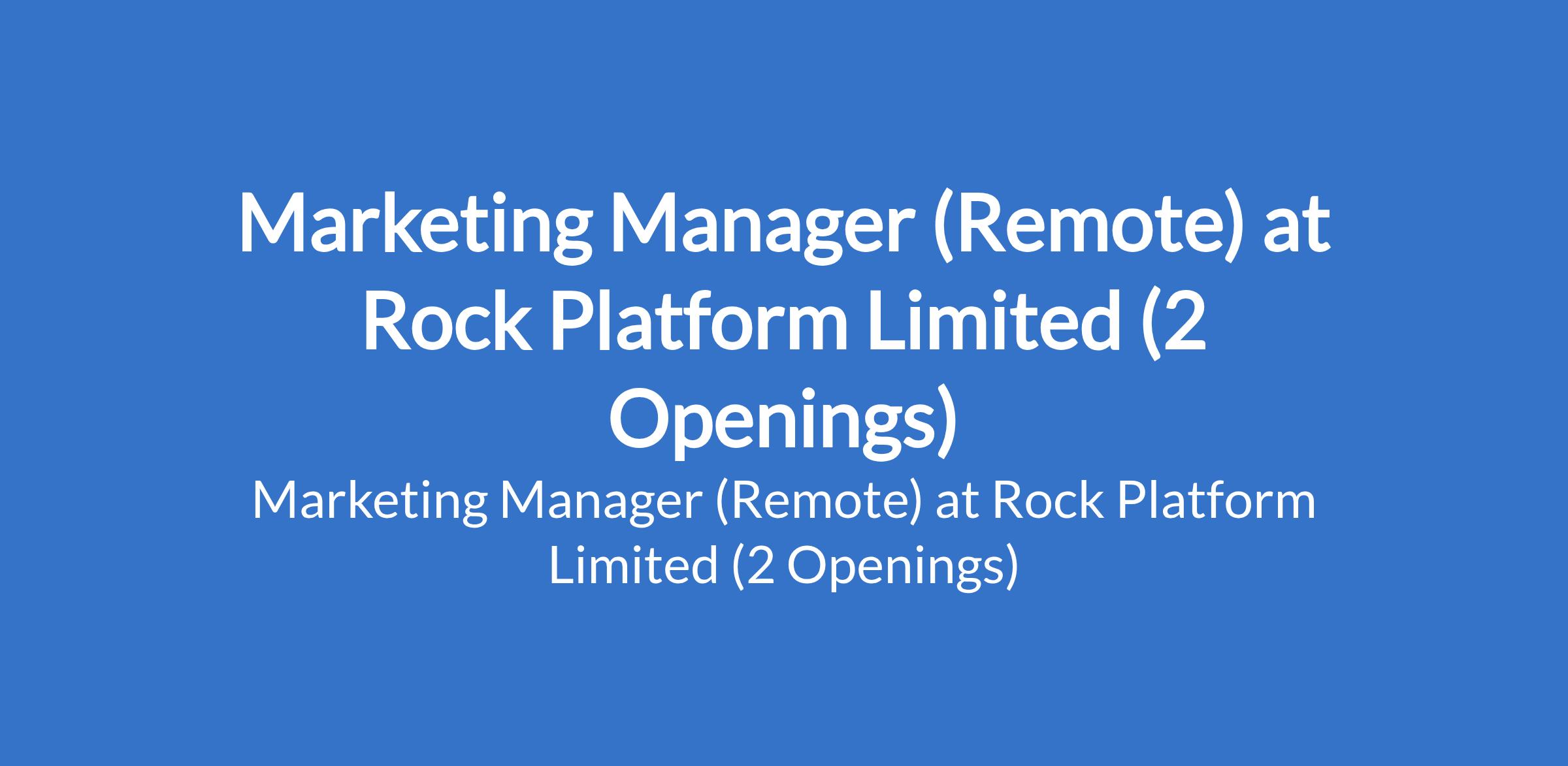 Rock Platform Limited is recruiting to fill the position of: Marketing Manager. The position is located in Abuja (FCT) and Lagos State (Remote). Salary: N100,000 - N180,000 monthly. Interested candidates should possess a Bachelors Degree in Marketing, Business Administration, Communications, Graphic Design, or a related field; a Masters Degree in Marketing, Digital Marketing, or Business Administration is preferred; with 3 - 5 years of experience in digital marketing.