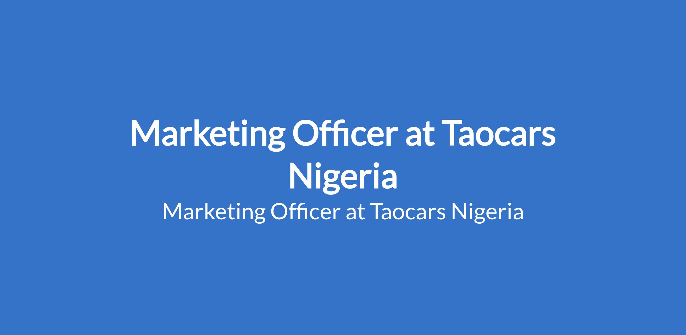 Taocars Nigeria is recruiting to fill the position of: Marketing Officer. The position is located in Lagos Island, Lagos State. Salary: N150,000 - N200,000 per month. Interested candidates should possess an NCE / OND / HND / B.Sc Degree with 1 - 5 years experience.
