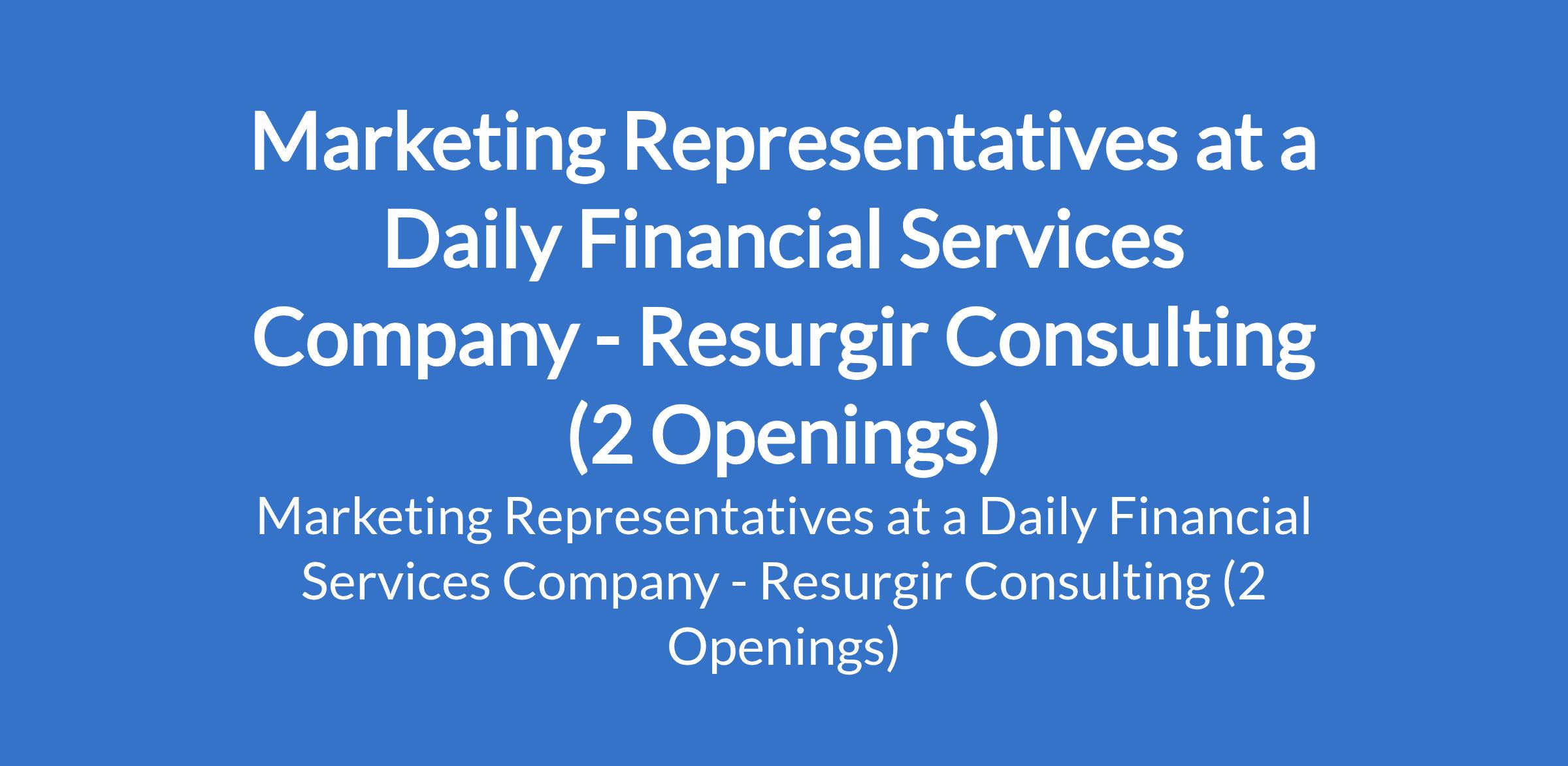 Resurgir Consulting - Our client, a daily financial services company is recruiting to fill the position of: Marketing Representative. The position is located in Tejuosho Road, Surulere - Lagos State. Salary: N100,000 per month. Interested candidates should possess an HND or BSc Degree in Marketing, Business Administration, or a relevant field with at least 1 year of marketing experience.