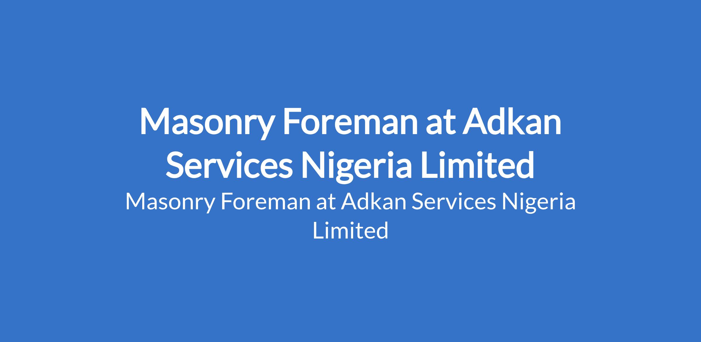 Adkan Services Nigeria Limited is recruiting to fill the position of: Masonry Foreman. The position is located in Abuja (FCT). The ideal candidate will lead a team of masons, ensure projects are completed on time, and maintain high standards of quality and safety. Interested candidates should possess relevant qualifications with 5+ years proven experience as a Masonry Foreman or senior mason.