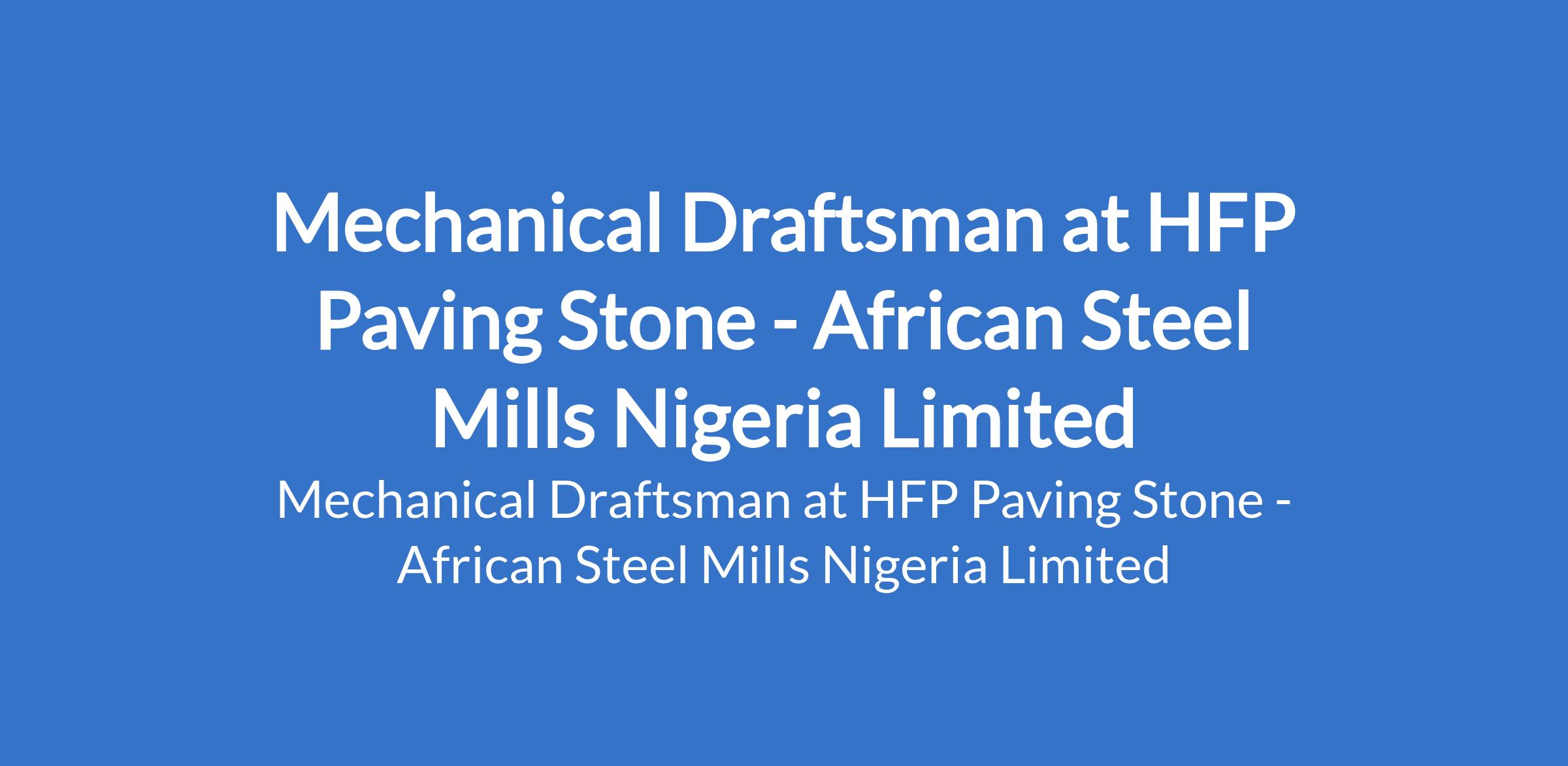 African Steel Mills Nigeria Limited - Our client, HFP Paving Stone, is recruiting to fill the position of: Mechanical Draftsman. The position is located in Lagos State. The ideal candidate will be responsible for preparing accurate mechanical drawings and technical designs to support production and engineering operations. Interested candidates should possess an OND / HND / BSc Degree in Mechanical Engineering or a related field with proven experience as a Mechanical Draftsman or similar role.
