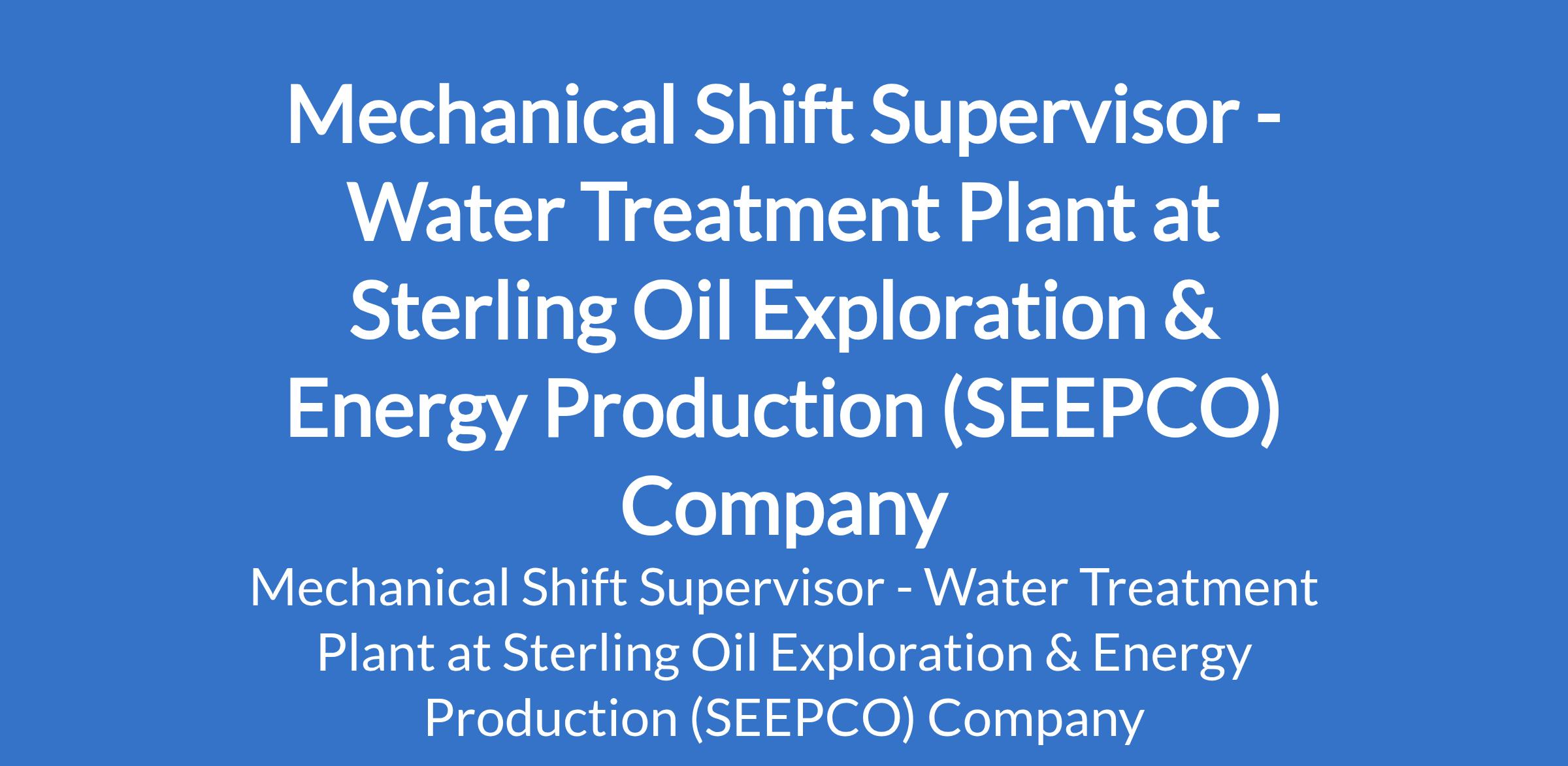 Sterling Oil Exploration & Energy Production (SEEPCO) Company is recruiting to fill the position of: Mechanical Shift Supervisor - Water Treatment Plant. The position is located in Akwa Ibom State. Interested candidates should possess a Diploma / Degree in Mechanical Engineering or a related field with 1012 years of experience in water treatment plant operations.