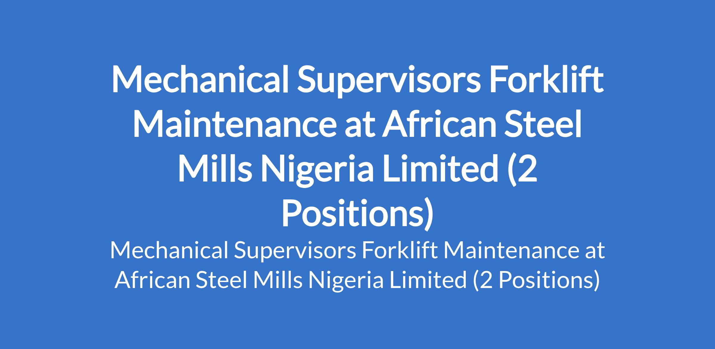 African Steel Mills Nigeria Limited is recruiting to fill the position of: Mechanical Supervisor Forklift Maintenance. The position is located in Lagos State. Interested candidates should possess a Bachelors Degree (B.E.) or Higher National Diploma (HND) in Mechanical Engineering, Automobile Engineering, or a related field with a minimum of 6 years relevant experience in forklift and heavy equipment maintenance.