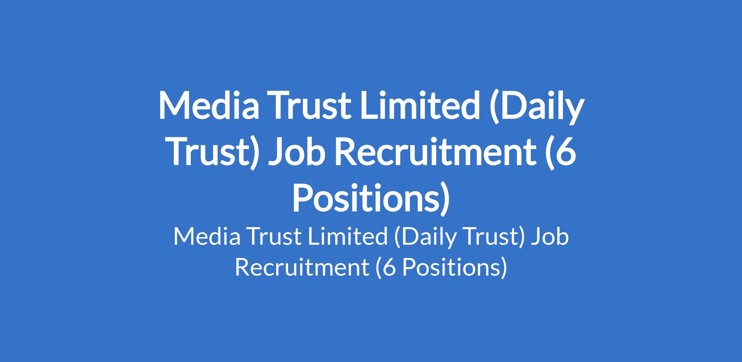 Media Trust Limited (Daily Trust) is recruiting suitably qualified candidates to fill the following positions in Abuja: Motion Graphics Designer, News Editor, Deputy Editor Aminiya, TV Producer, Bilingual Radio Presenter, and Multimedia Sports Journalist.