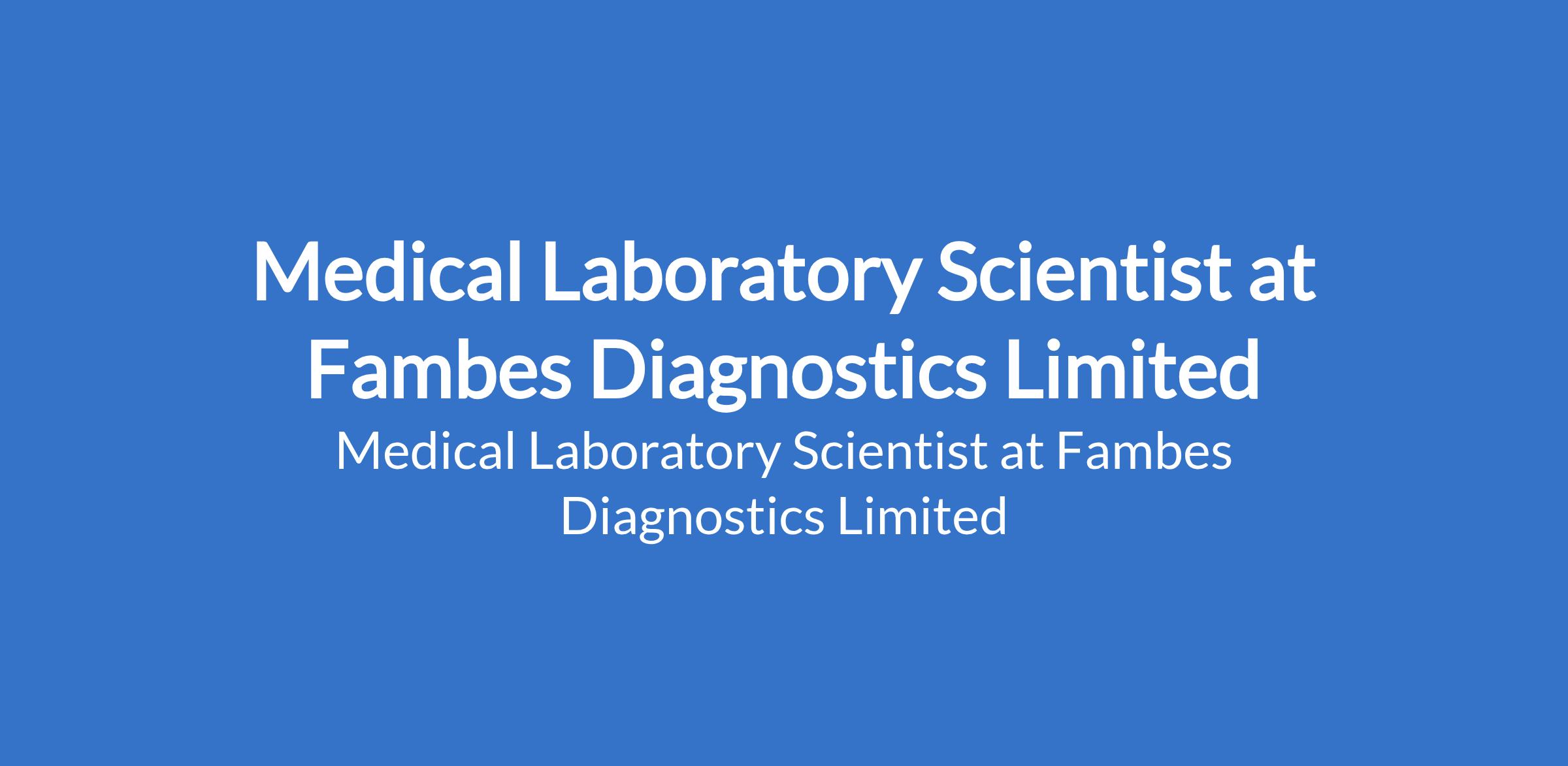 Fambes Diagnostics Limited is recruiting to fill the position of: Medical Laboratory Scientist. The position is located in Idimu, Lagos State. Salary: N150,000 - N250,000 monthly. Interested candidates should possess a Bachelors Degree in Medical Laboratory Science, and a Valid practicing license (MLS certification), with a minimum of one year relevant experience (preferred)