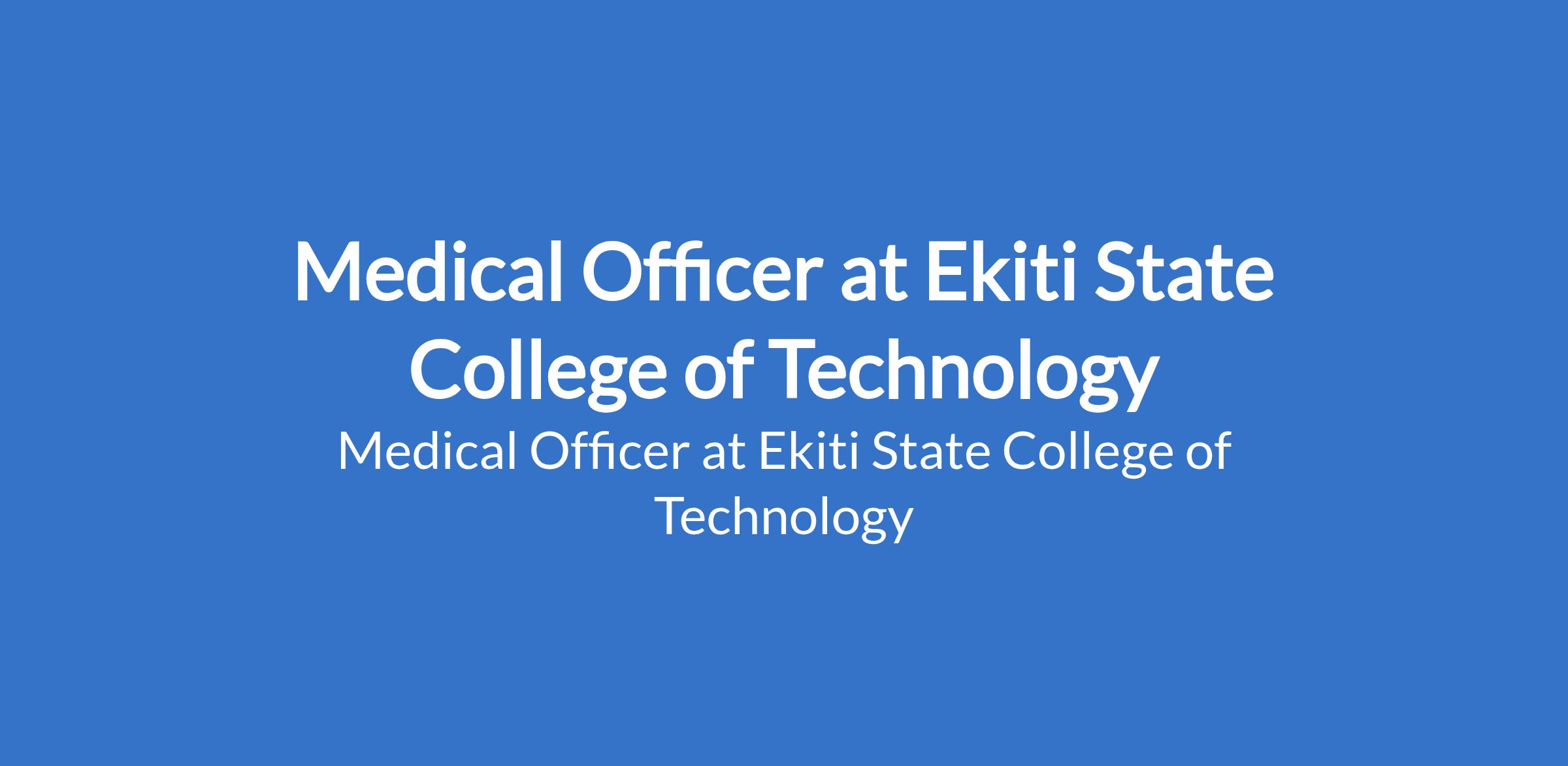Ekiti State College of Technology is recruiting to fill the position of: Medical Officer. Interested candidates should possess an MBBS qualification, must be registration with the Medical and Dental Council of Nigeria (MIDCN) and must have observed the mandatory NYSC service evidenced by the discharge certificate.