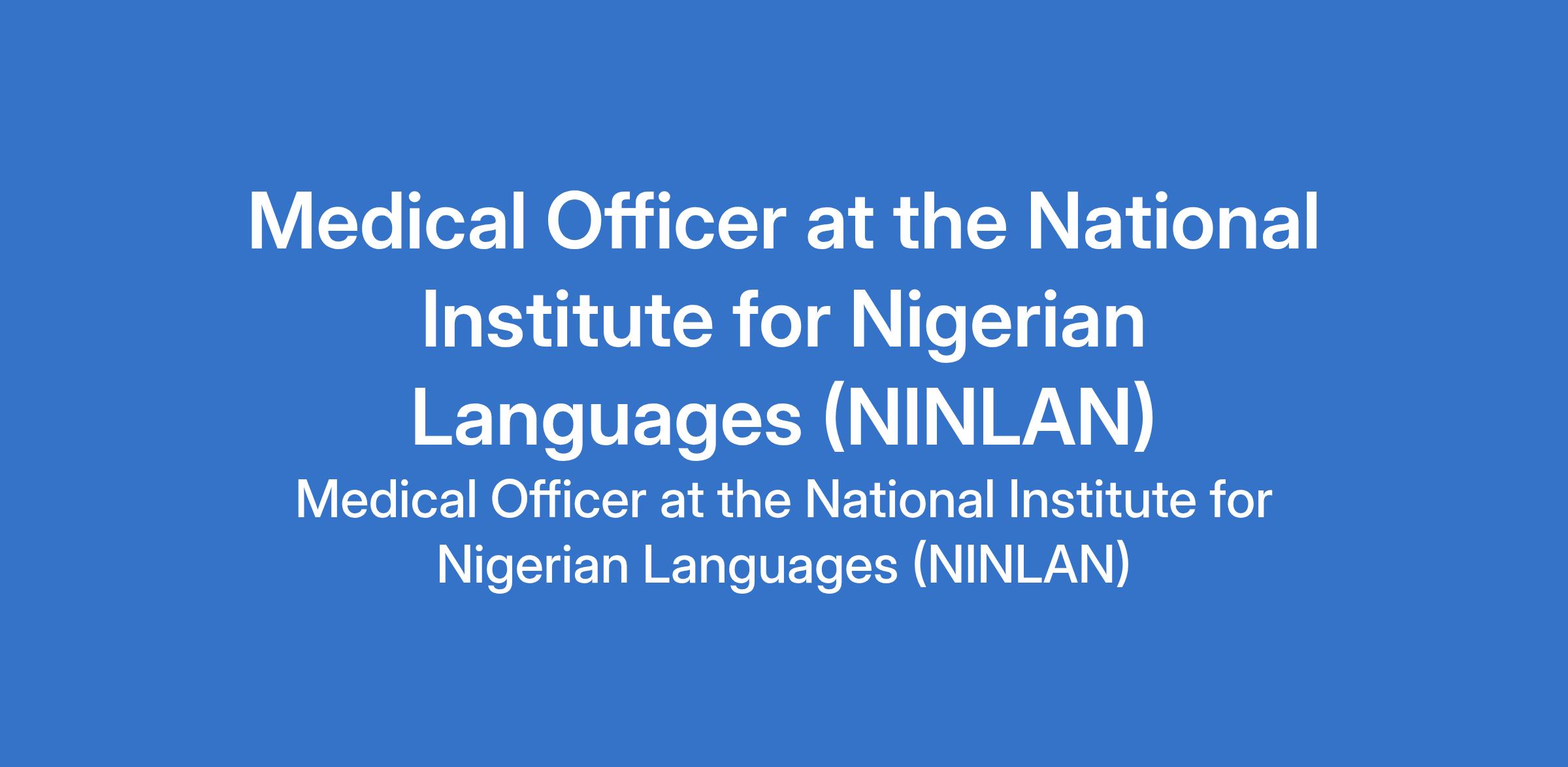 The National Institute for Nigerian Languages (NINLAN) is recruiting to fill the position of: Medical Officer. The position is located in Aba, Abia State. Interested candidates should possess an MBBS Degree or equivalent qualification, full registration with the Medical and Dental Council of Nigeria and have completed an internship and NYSC.