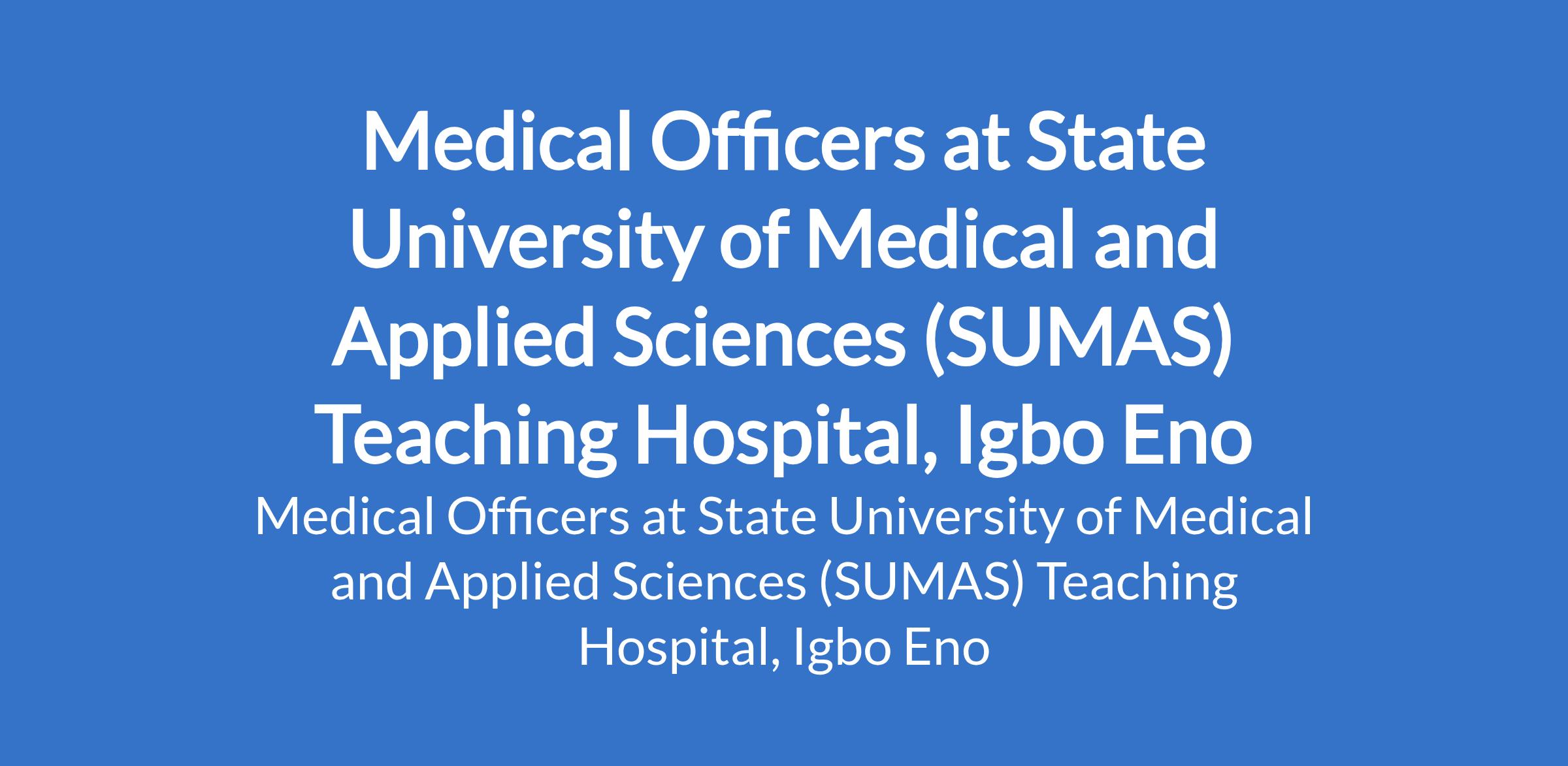 State University of Medical and Applied Sciences (SUMAS) Teaching Hospital, Igbo Eno invites applications from suitable candidates for the position of: Medical Officer. The position is located in Enugu State. Interested candidates should possess a Bachelor of Medicine / Bachelor of Surgery from any recognized institution with Completion of one year houseman-ship and one year National Youth Service Corps (NYSC) or exemption letter.