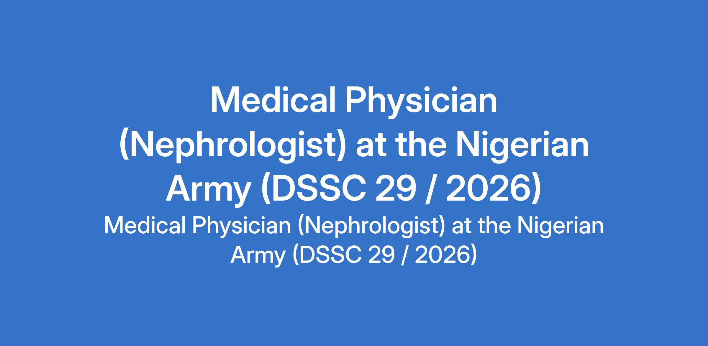 The Nigerian Army invites applications from eligible Nigerians for the Direct Short Service Commission (DSSC) position of: Medical Physician (Nephrologist). Interested candidates must be Fellow of the National Postgraduate Medical College of Nigeria or equivalent Postgraduate Medical College, must have full registration of Medical and Dental Council of Nigeria (MDCN) for the undergraduate degree and additional qualification registration as appropriate and are expected to present proof of registration with their professional regulatory bodies and current practicing license.