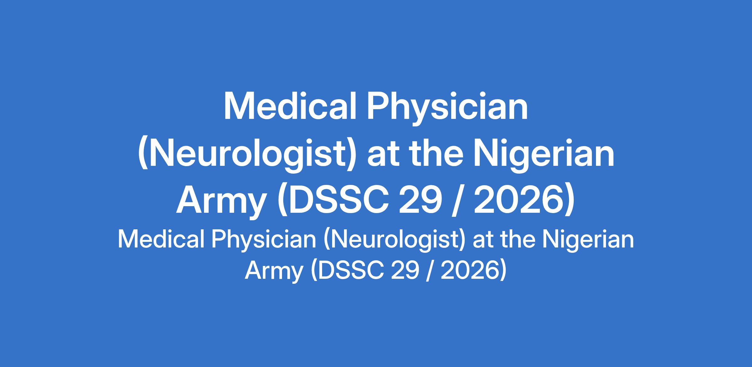 The Nigerian Army invites applications from eligible Nigerians for the Direct Short Service Commission (DSSC) position of: Medical Physician (Neurologist). Interested candidates must be Fellow of the National Postgraduate Medical College of Nigeria or equivalent Postgraduate Medical College, must have full registration of Medical and Dental Council of Nigeria (MDCN) for the undergraduate degree and additional qualification registration as appropriate and are expected to present proof of registration with their professional regulatory bodies and current practicing license.
