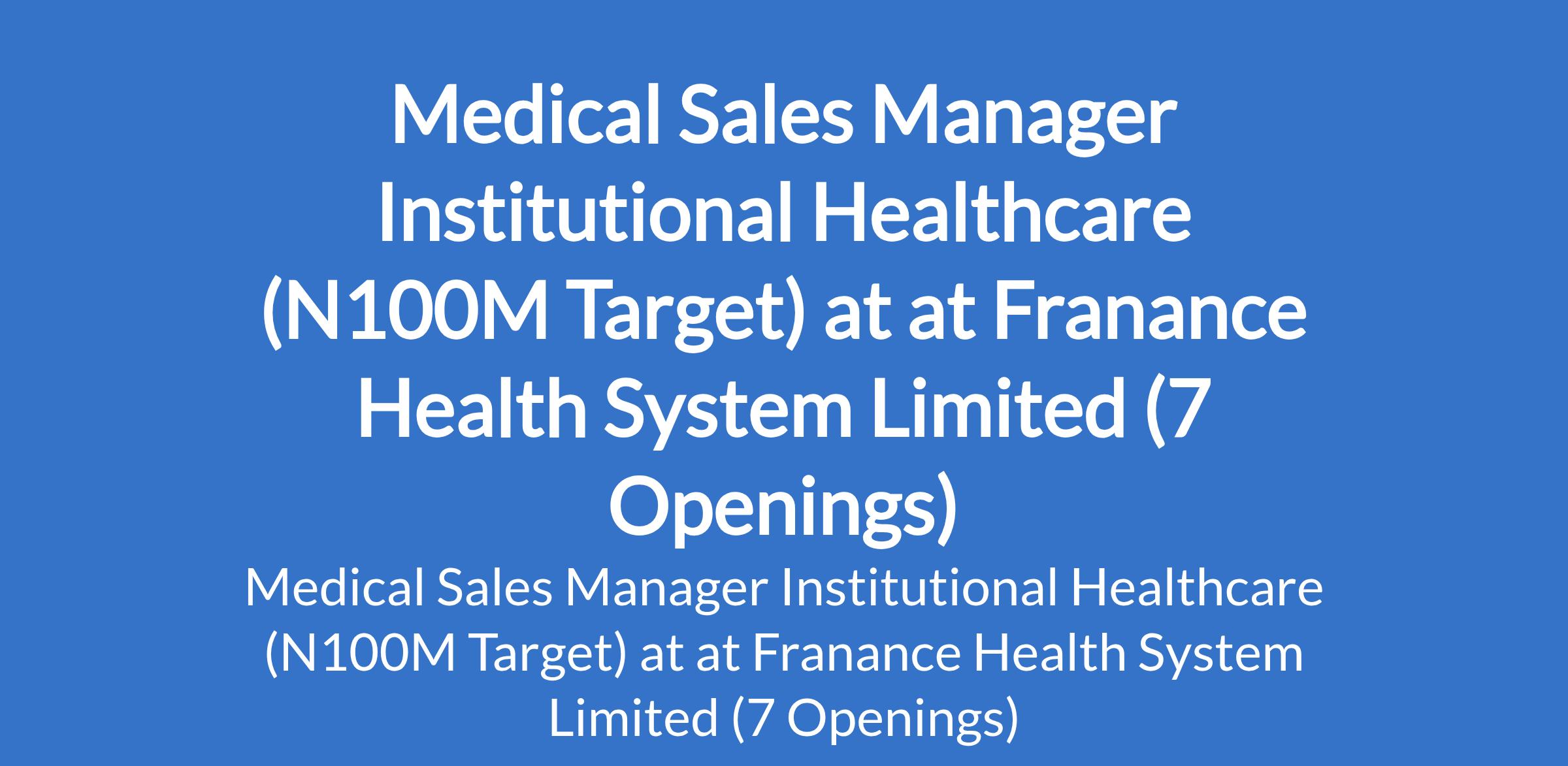 Franance Health Systems Limited is recruiting to fill the position of: Medical Sales Manager Institutional Healthcare (N100M Target). The position is located in Abuja (FCT), Adamawa, Cross River, Edo, Lagos, Nasarawa and Osun States. Salary: N3,000,000 - N4,200,000 / Annum. Interested candidates should possess relevant qualifications with proven track record of closing 20M+ B2B or institutional deals.