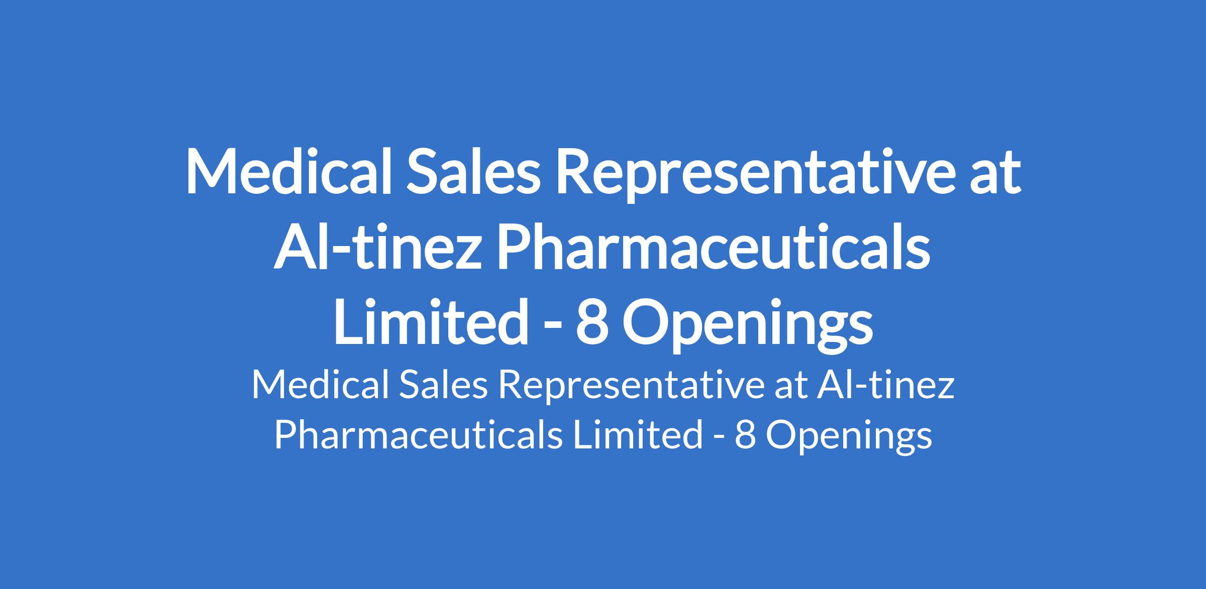 Al-tinez Pharmaceuticals Limited is recruiting to fill the position of: Medical Sales Representative. The position is located in Abia, Akwa Ibom, Cross River, Kaduna, Kano, Lagos, Plateau and Rivers States. Interested candidates should possess a Degree in Pharmacy or in any other science related course.