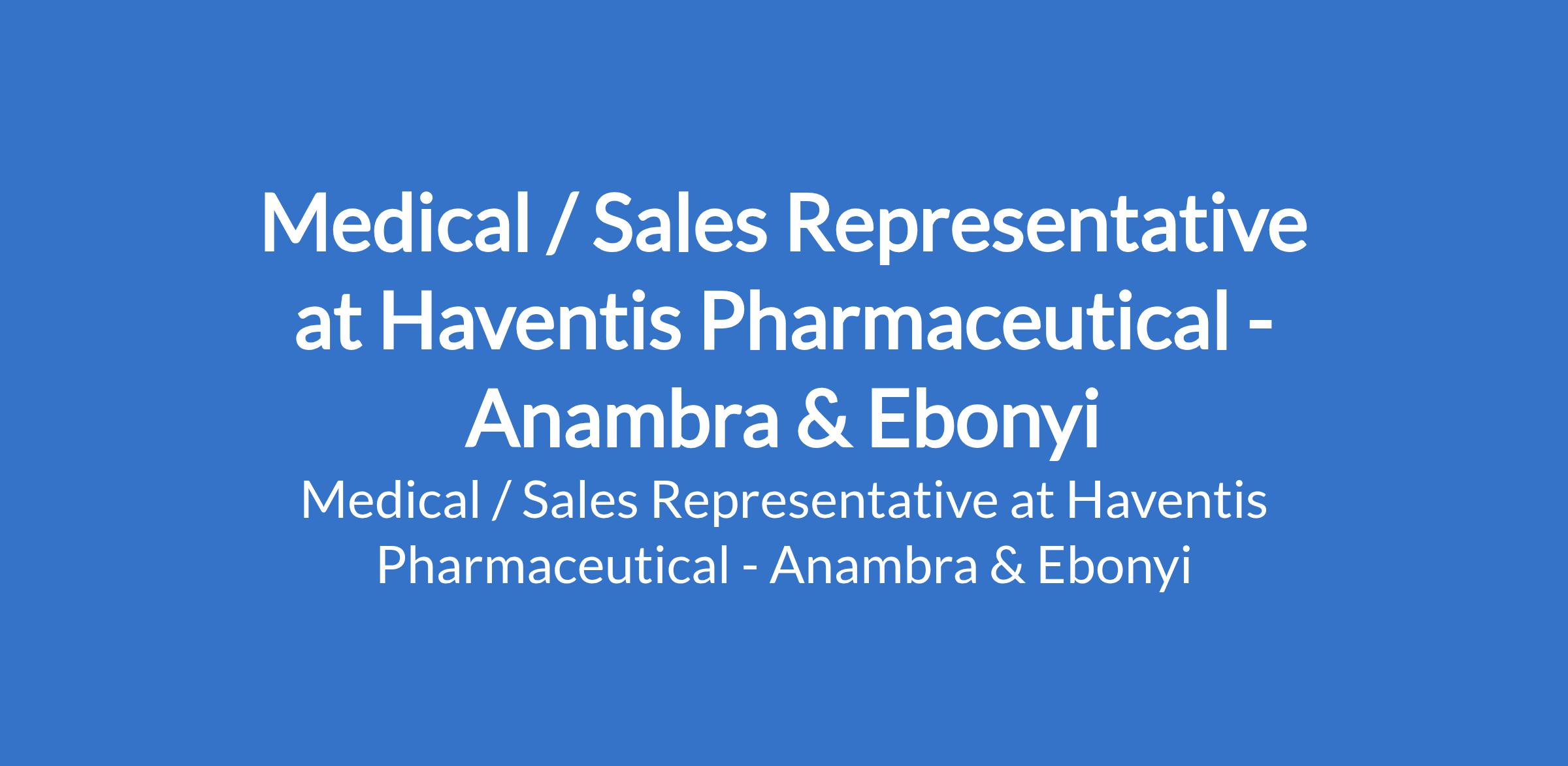Haventis pharmaceutical is recruiting to fill the position of: Medical/sales representative. The position is located in Anambra, Ebonyi States. Salary: N100,000. Interested candidates should possess a relevant qualifications with 0 - 1 year of relevant work experience.