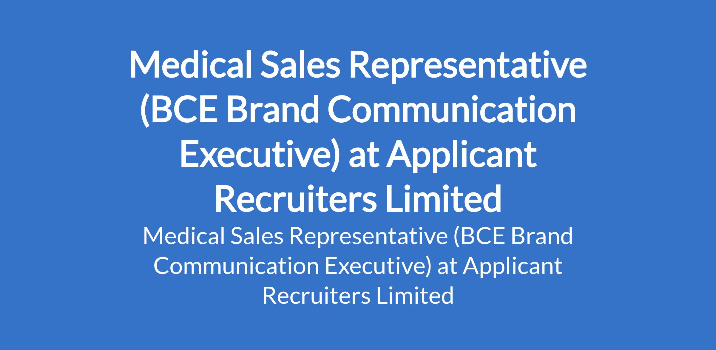 Applicant Recruiters Limited is recruiting to fill the position of: Medical Sales Representative (BCE Brand Communication Executive). The position is located in Abuja. Interested candidates should possess a Bachelors Degree in Pharmacy, Biological Sciences, Chemistry, Biochemistry, Food science/technology or a related field with 24 years of experience in pharmaceutical or medical sales.