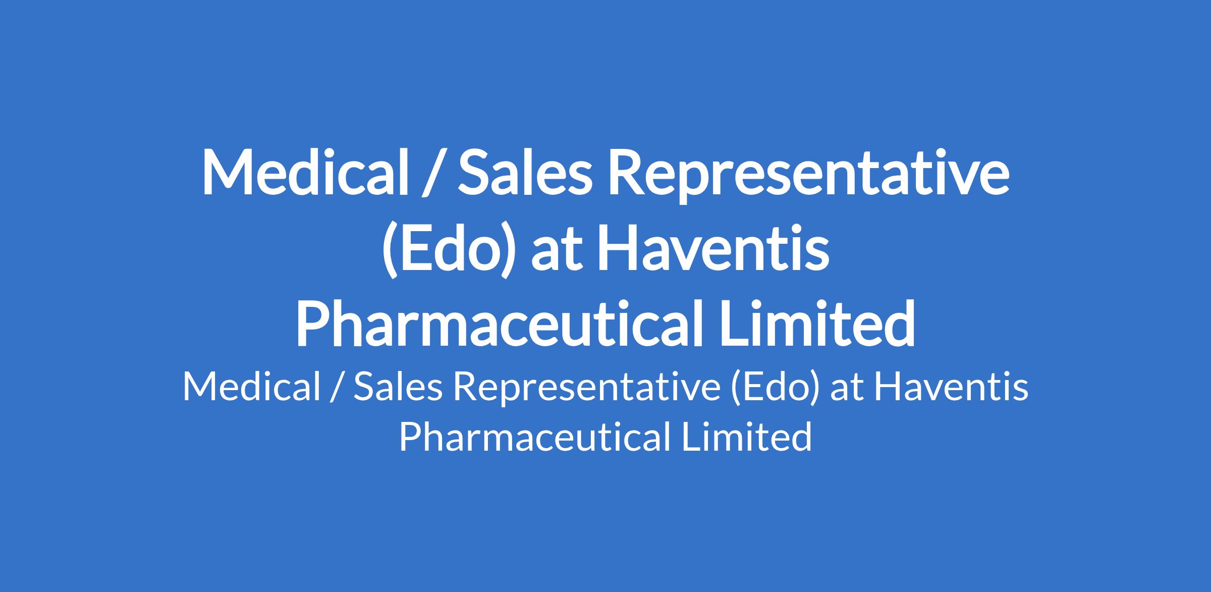 Haventis Pharmaceutical Limited is recruiting to fill the position of: Medical / Sales Representative. The position is located in Edo State. Interested candidates must be bold and have a good communication skills.