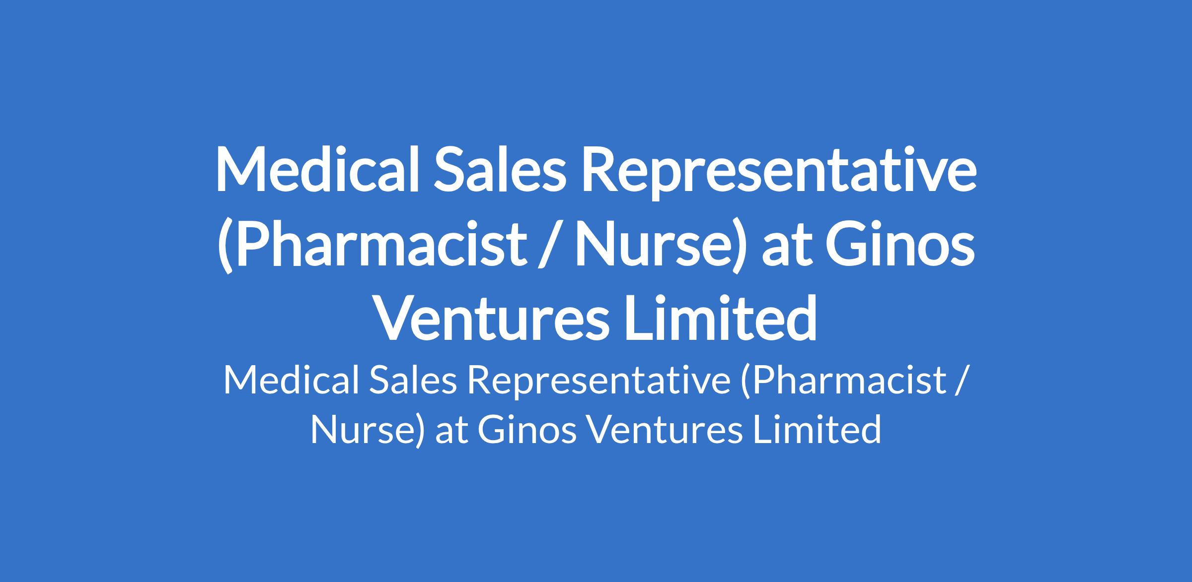 Ginos Ventures Limited is recruiting to fill the position of: Medical Sales Representative (Pharmacist / Nurse). The position is located in Abuja (FCT). Interested candidates should possess a Bachelor's Degree in a Medical related field (Pharmacist / Nurse), with a minimum of 3 years of field sales experience, especially in the Medical / Pharmaceutical Sector, and must be resident in Abuja and familiar with the locations of health institutions in the FCT.