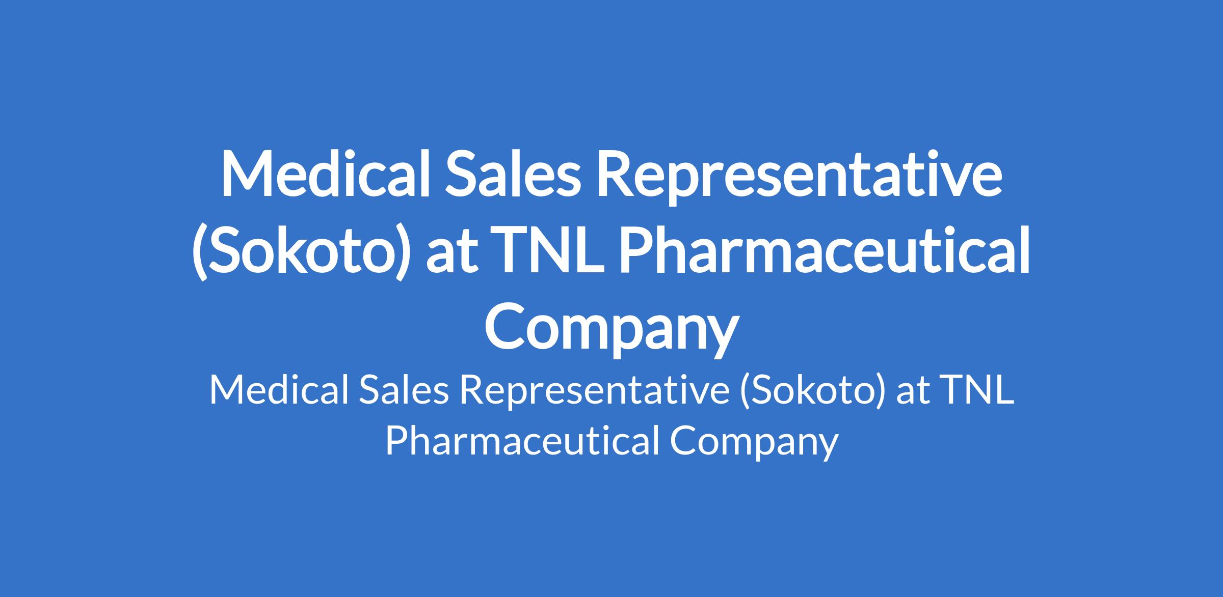 TNL Pharmaceutical Company is recruiting to fill the position of: Medical Sales Representative. The position is located in Sokoto State. Interested candidates should possess a Bachelor's Degree; must have completed NYSC with a maximum of 28 years of age.