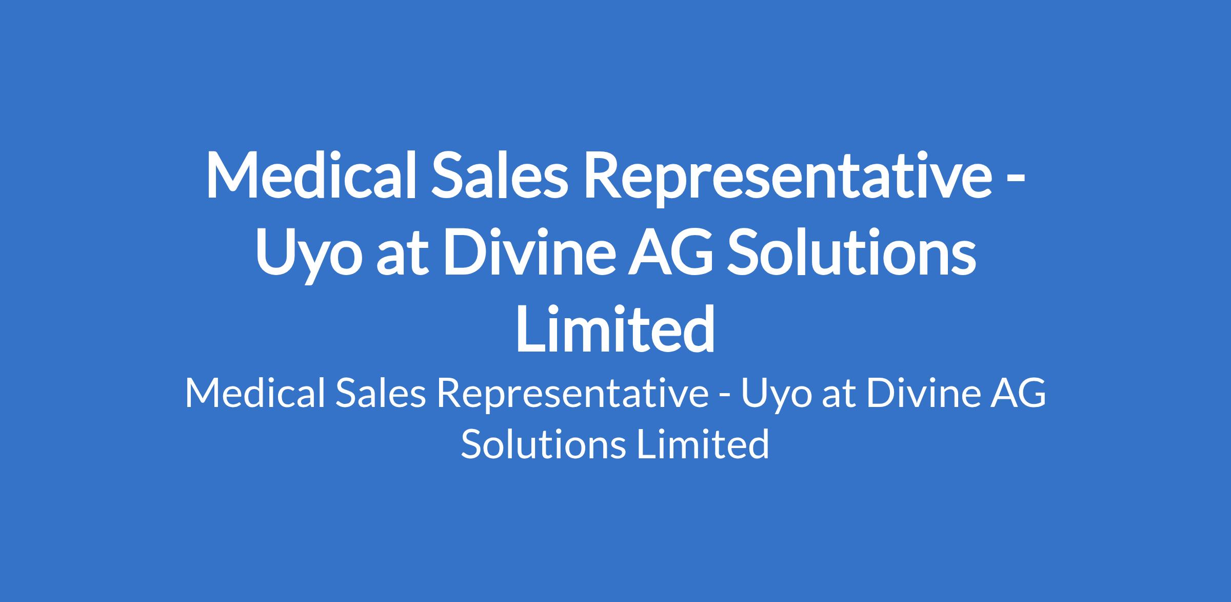 Divine AG Solutions Limited is recruiting to fill the position of: Medical Sales Representative. The position is located in Uyo, Akwa-Ibom State. Salary: N350,000 monthly. Interested candidates should possess a Degree in Biological Sciences or related courses with 2 - 4 years of experience as a medical sales representative and must be currently residing in Uyo.