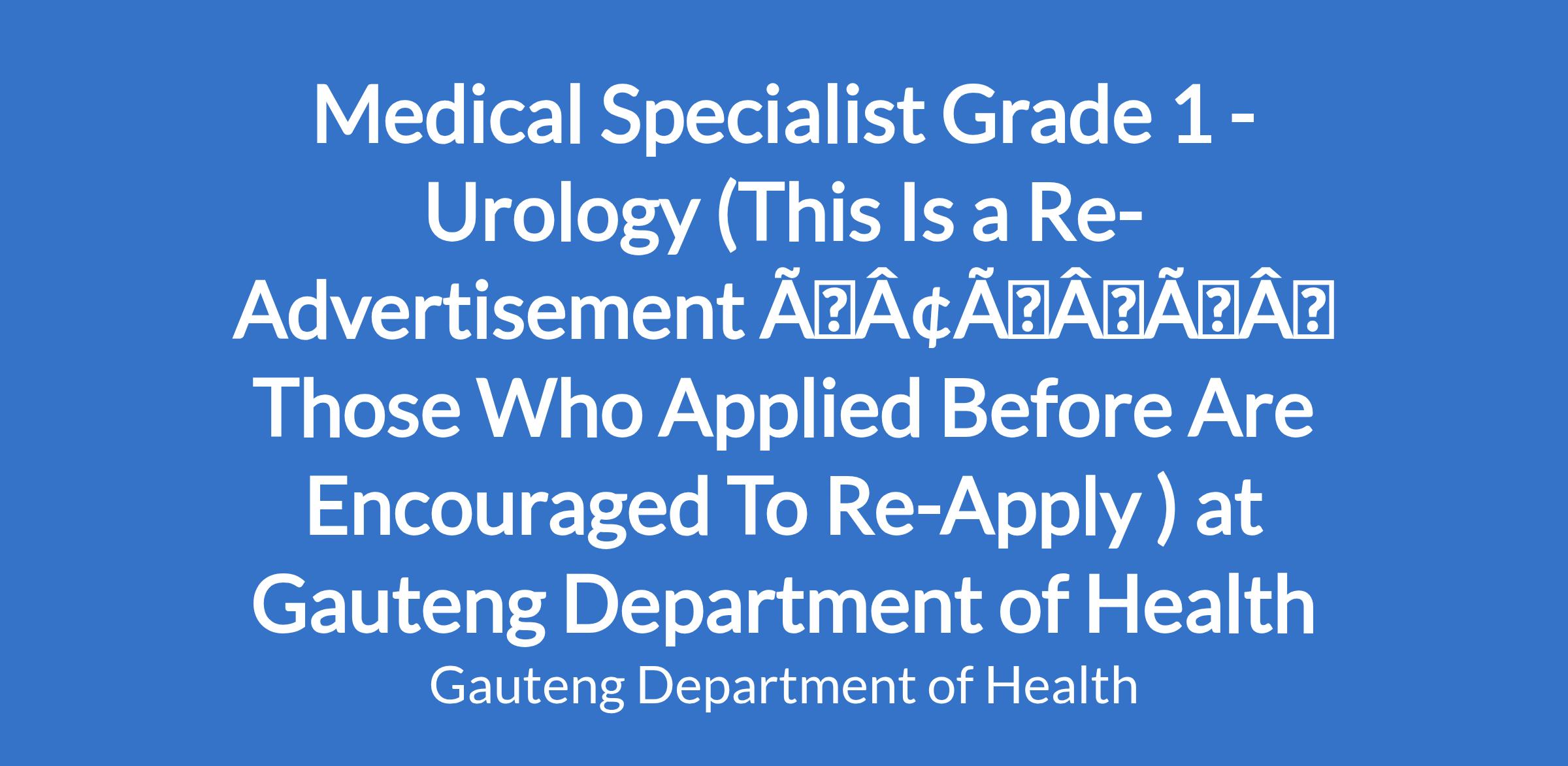 Medical Specialist Grade 1 - Urology (This Is a Re-Advertisement âÃÂàThose Who Applied Before Are Encouraged To Re-Apply ) at Gauteng Department of Health