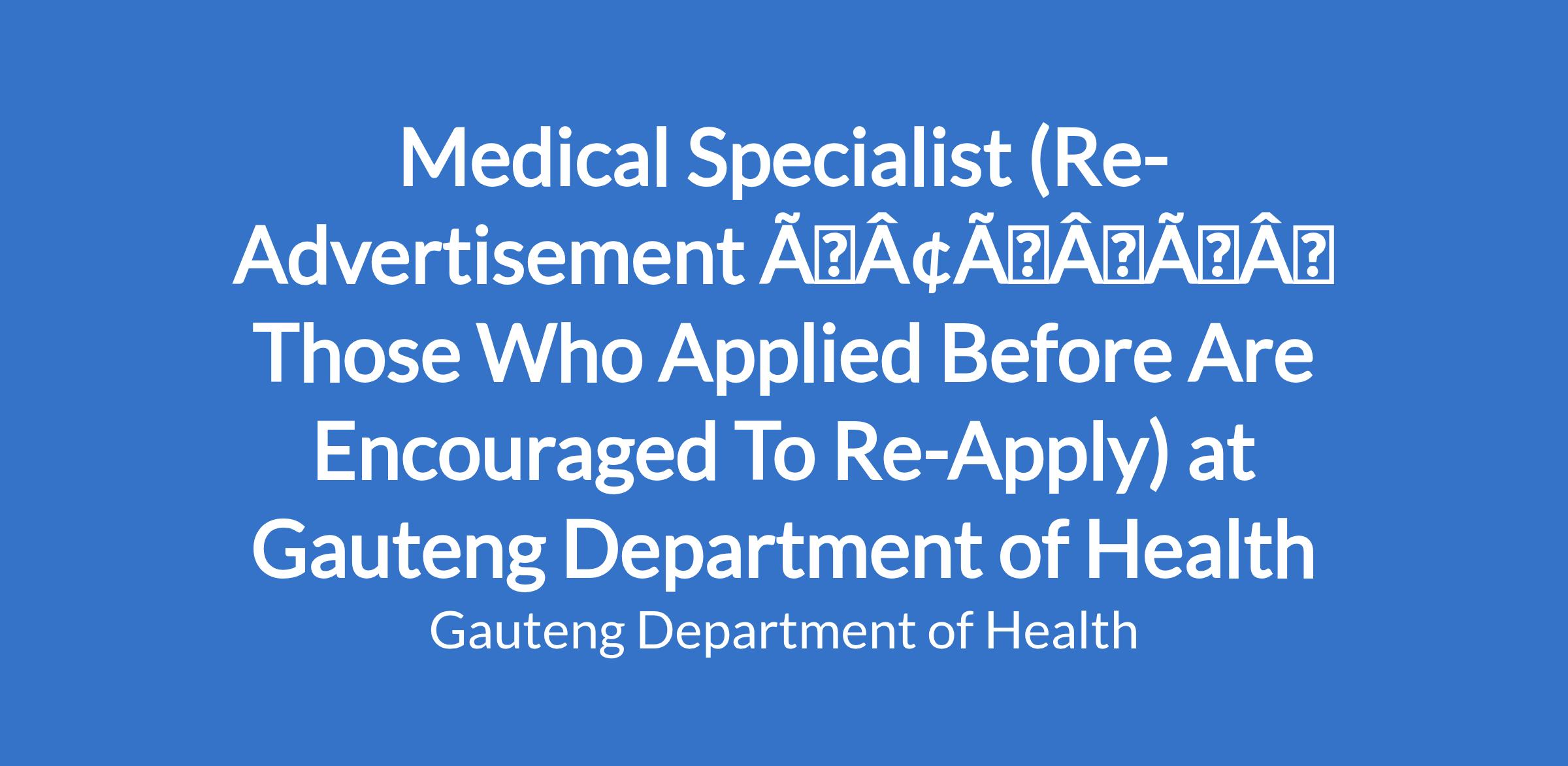 Medical Specialist (Re-Advertisement âÃÂàThose Who Applied Before Are Encouraged To Re-Apply) at Gauteng Department of Health