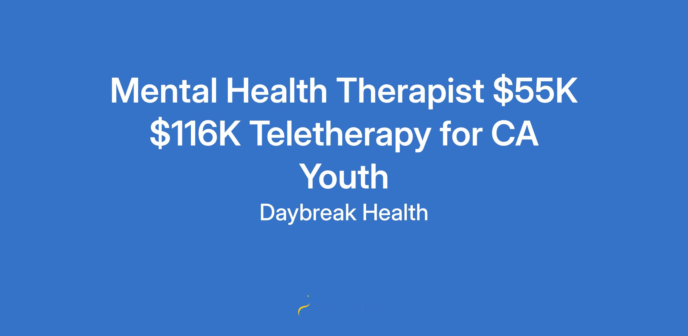 Daybreak Health is on a mission to make high-quality mental health care accessible to every young person in California. Weâre looking for LCSW, LPCC, or LMFT clinicians to deliver teletherapy in partnership with schools, families, and community organizationsâright from your home office.