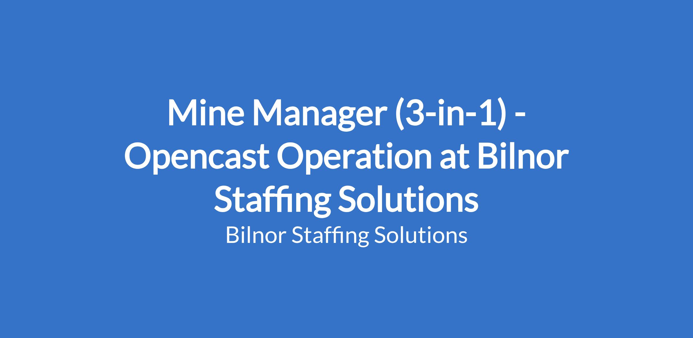Bilnor Staffing Solutions' client in the Mining sector is seeking a Mine Manager Opencast Operation for position in Rustenburg, NW. South African Citizens and those living in the area will be preferred.