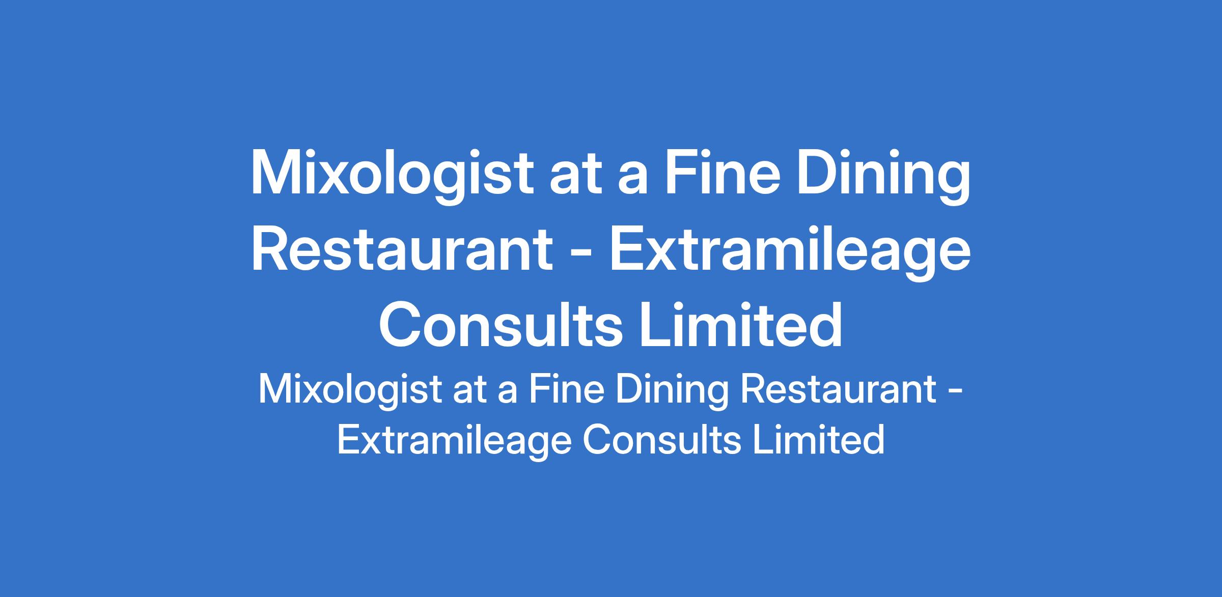 Extramileage Consults Limited - Our client, a Fine Dining Restaurant is recruiting to fill the position of: Mixologist. The position is located in Lekki Phase 1, Lagos State. Salary: N80,000 - N120,000 monthly. Interested candidates should possess relevant qualifications with a minimum of 1 year experience in similar role.