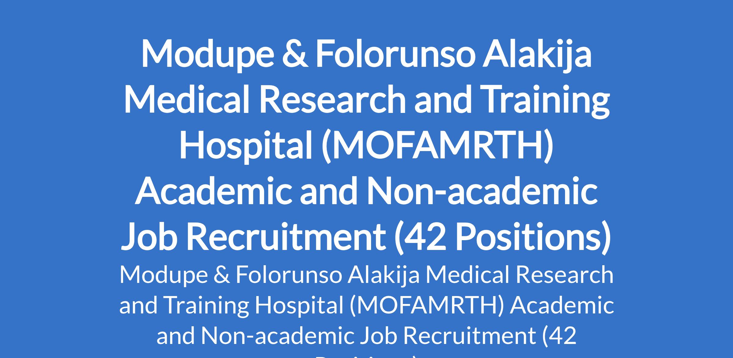Modupe & Folorunso Alakija Medical Research and Training Hospital (MOFAMRTH) Academic and Non-academic Job Recruitment (42 Positions)