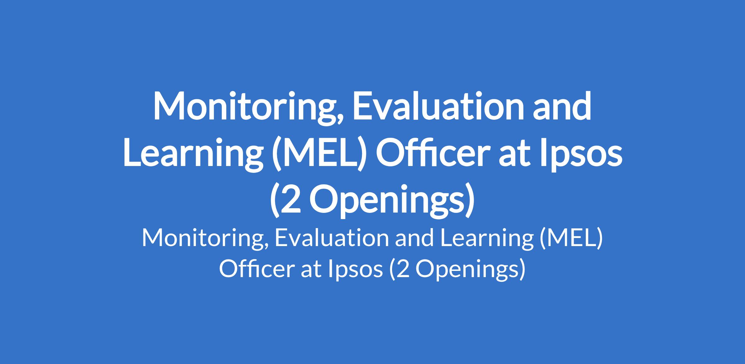 Ipsos is recruiting to fill the position of: Monitoring, Evaluation and Learning (MEL) Officer. The position is located in Abuja and Lagos State. Interested candidates should possess a Bachelor's Degree in Social Sciences, Development Studies, Statistics, Economics, Public Policy, Research Methods, or a related field with 3-5 years of relevant experience in monitoring and evaluation, impact assessment, research, or development programs.