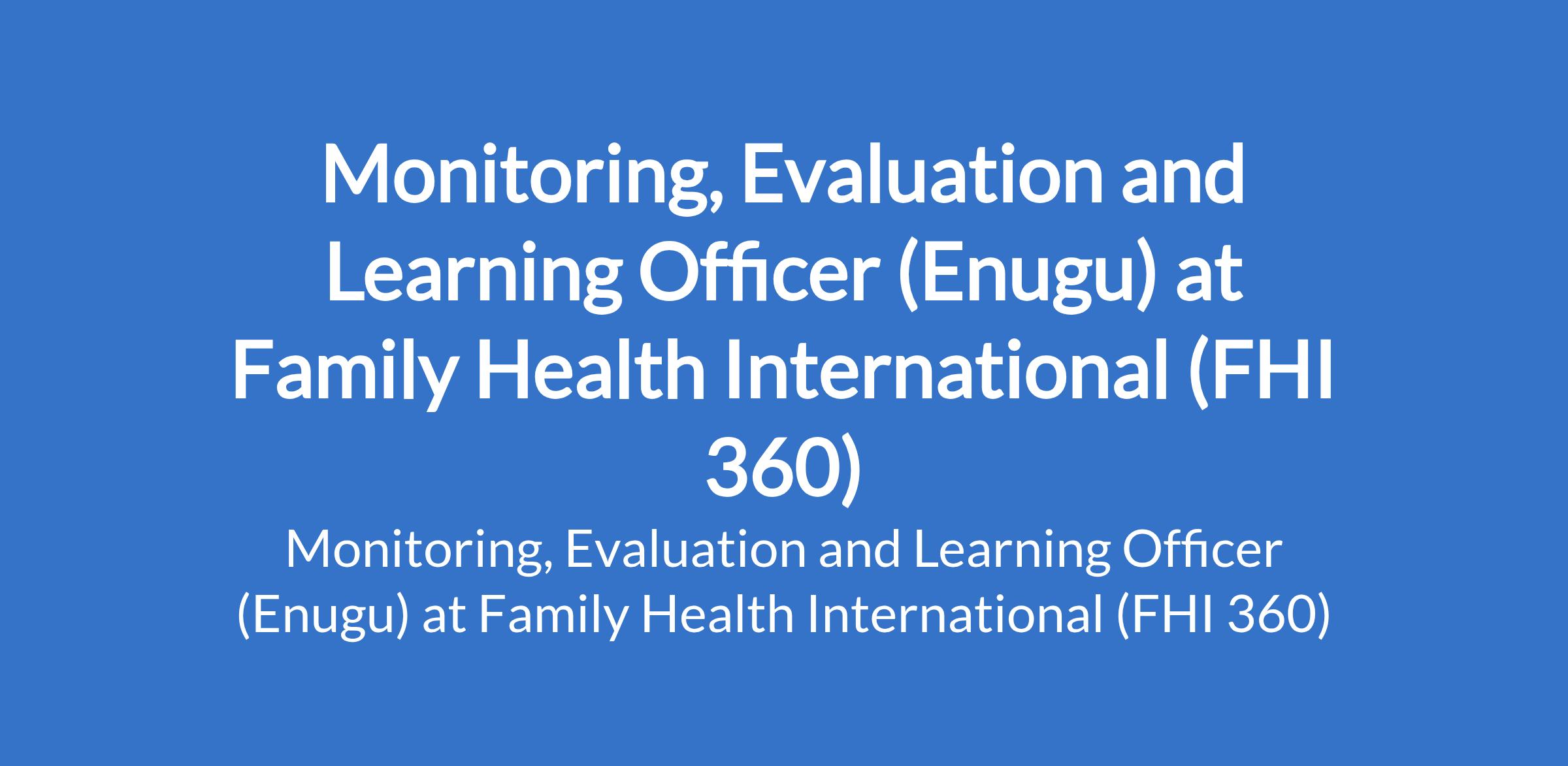 Family Health International (FHI 360) is recruiting to fill the position of: Monitoring, Evaluation and Learning Officer. The position is located in Enugu State. Interested candidates should possess a Bachelor's Degree or its International Equivalent in Data Science, Monitoring and Evaluation, Public Health, Epidemiology, Biostatistics, Health, Behavioural, Life/Social Sciences, International Development, Human Development, or a related field with 4+ years of relevant experience in monitoring, evaluation, and learning, including managing data collection, analysis, and reporting at the program or project level and prior work experience in a non-governmental organization (NGO), government agency, or international organization preferred.