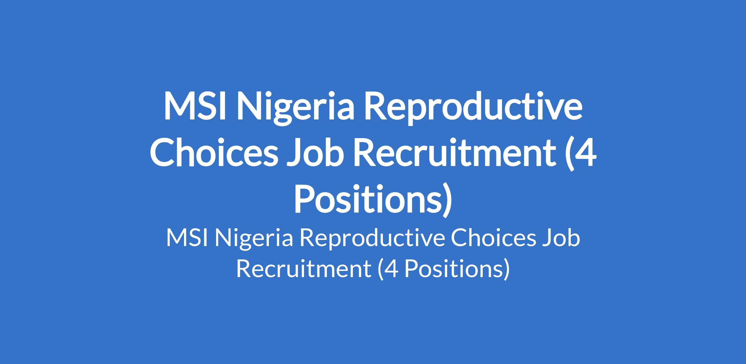 MSI Nigeria Reproductive Choices is recruiting suitable candidates to fill the following positions in Abuja, Ebonyi, Kwara, and Oyo States: Regional Manager, South West; Head of Finance & Accounts; Clinical Service Provider (CSP); and Social & Behaviour Change Communication Officer (SBCCO).