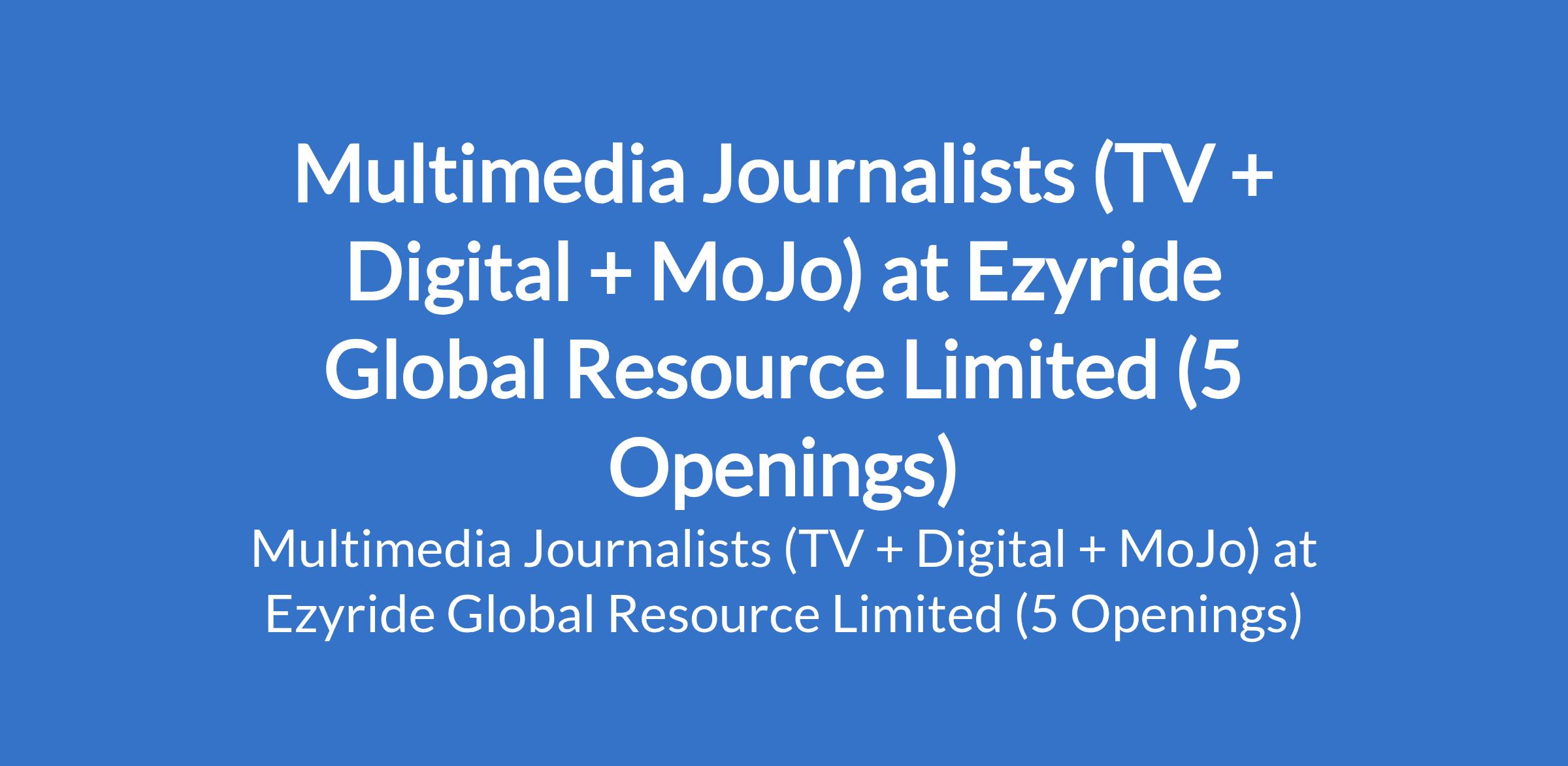 Ezyride Global Resource Limited is recruiting to fill the position of: Multimedia Journalist (TV + Digital + MoJo). The position is located in Abuja (FCT). Salary: N250,000 - N500,000 per month. Interested candidates should have relevant qualifications with 2-8 years experience.