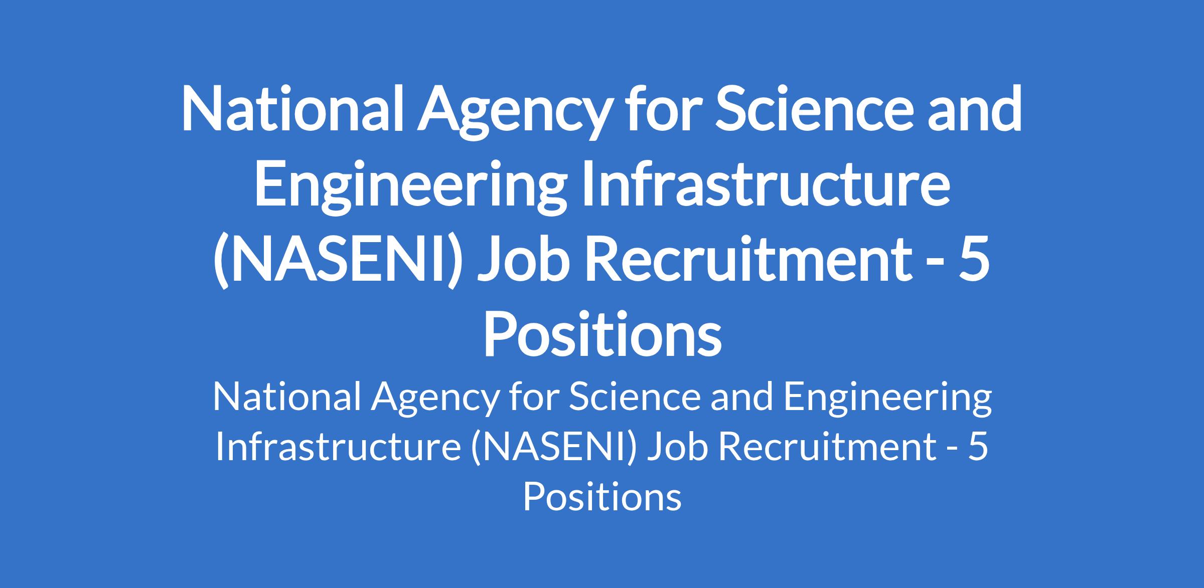 National Agency for Science and Engineering Infrastructure (NASENI) is recruiting suitable candidates to fill the following positions in Benue, Borno, Enugu, Kano, Lagos States: Factory Operations Manager; Quality Control and Assurance Engineer; Supply Chain and Logistics Officer; Health, Safety and Environment (HSE) Officer; and Marketing and Sales Coordinator.