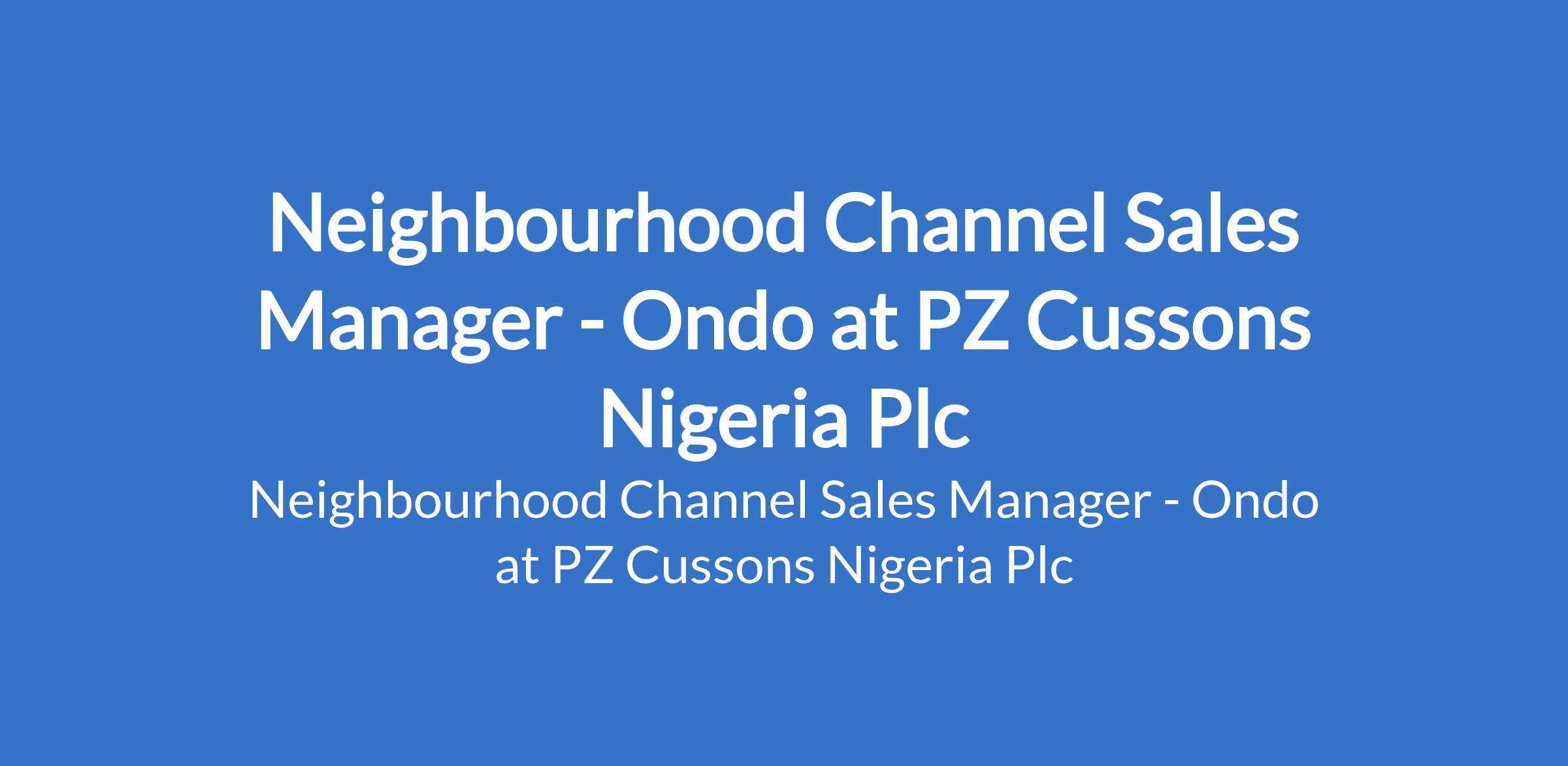 PZ Cussons Nigeria Plc is recruiting to fill the position of: Neighbourhood Channel Sales Manager. The position is located in Akure, Ondo State. Interested candidates should possess a First Degree in any discipline with a minimum of 1 year experience in marketing or sales, and over this period has successfully delivered on KPIs.
