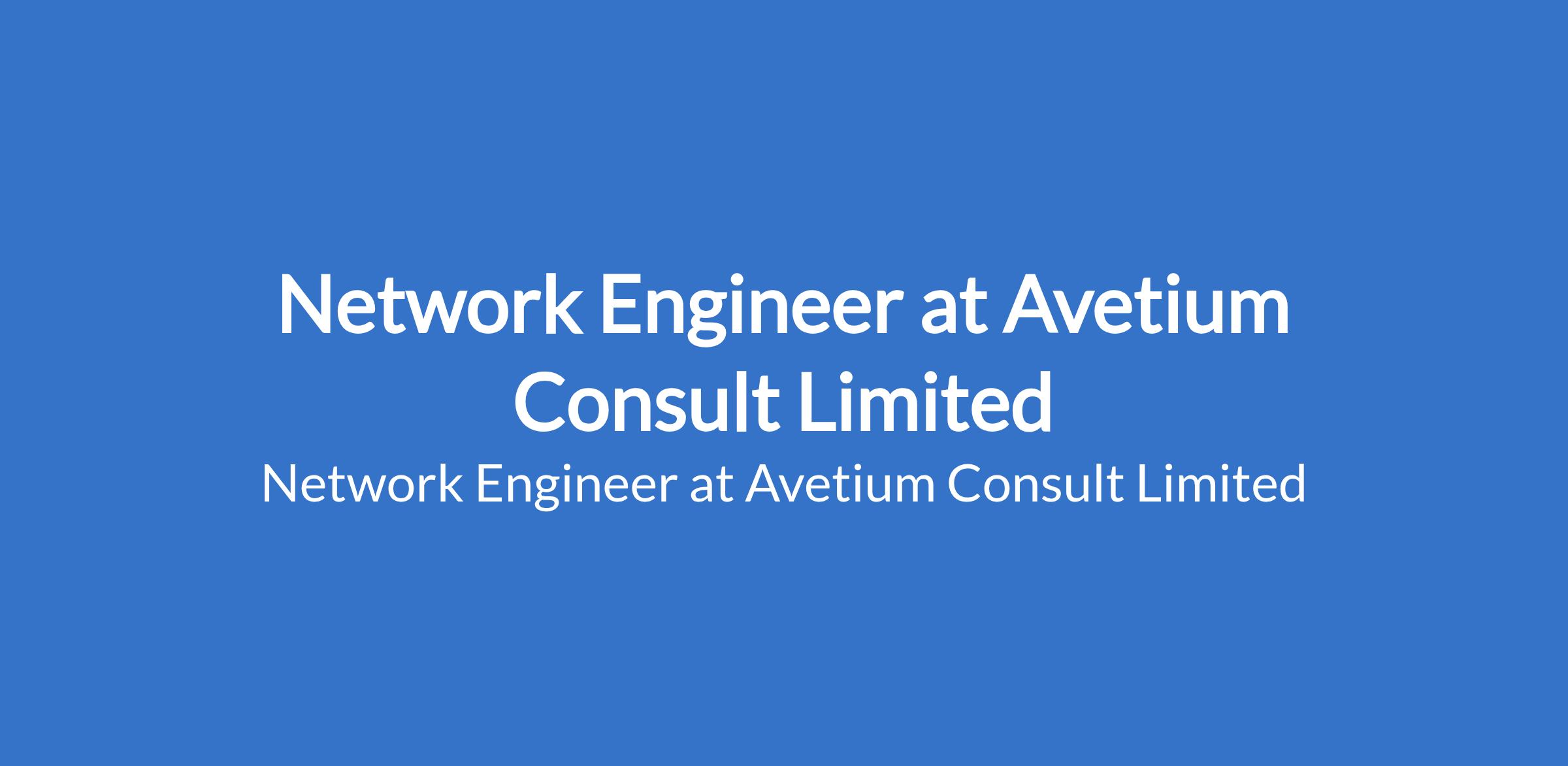 Avetium Consult Limited is recruiting to fill the position of: Network Engineer. The position is located in Lagos State. Interested candidates should possess a minimum of B.Sc in Electrical / Electronics / Computer Engineering and Information Systems with 7+ years in network engineering, with a focus on Cisco technologies.