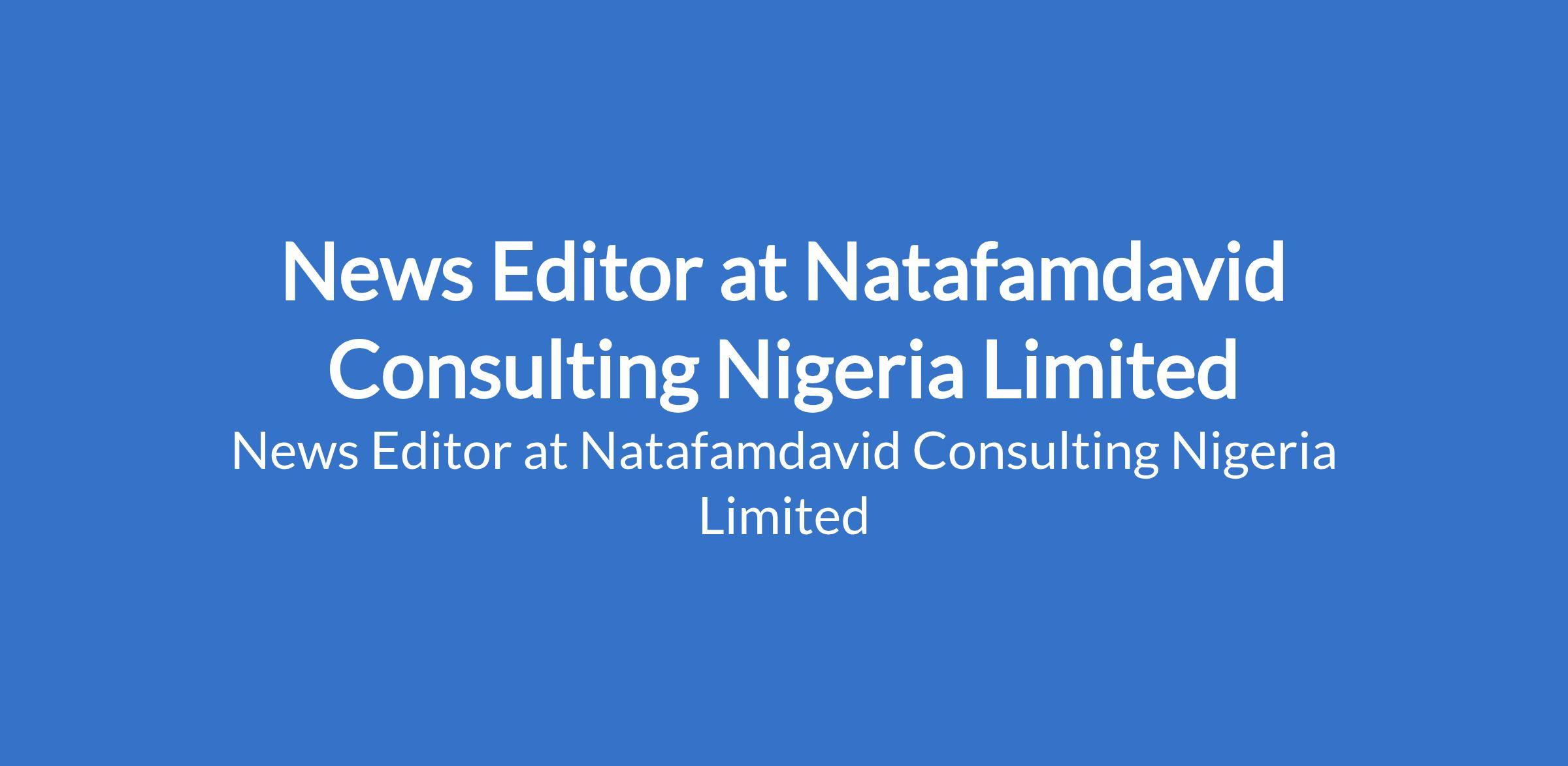 Natafamdavid Consulting Nigeria Limited is recruiting to fill the position of: News Editor. The position is located in Ikeja, Lagos State. Interested candidates should possess a minimum of B.Sc / HND in Mass Communication, Journalism, or related field with 35 years experience in journalism or newsroom operations, preferably in TV or radio broadcasting.