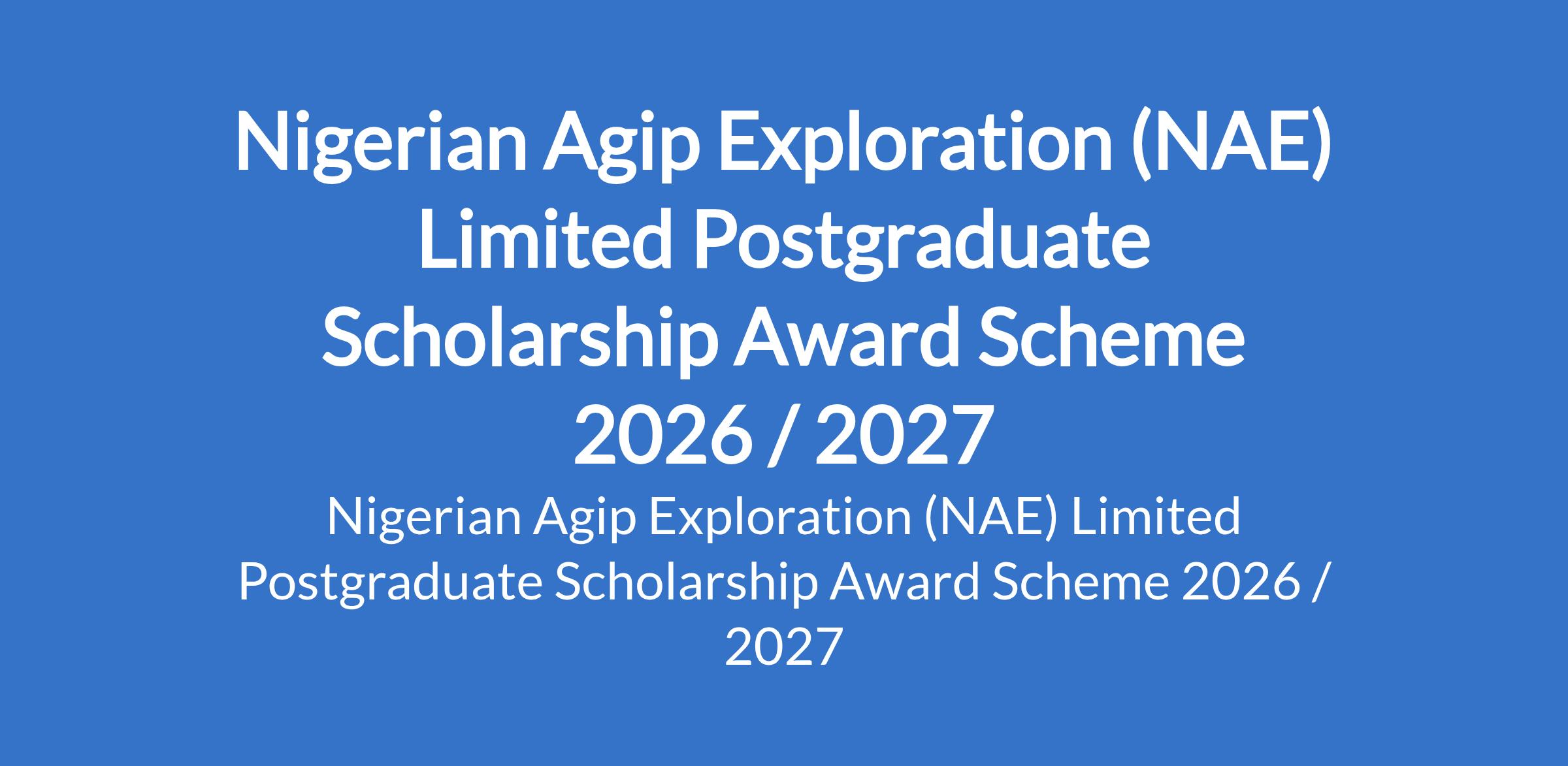 Nigerian Agip Exploration (NAE) Limited, operator of the NNPC & NAE PSC invites applications from suitable candidates for the 2026 / 2027 Postgraduate Scholarship Award Scheme. The Scholarship Award Scheme is in two categories (Local and Overseas). Interested candidates should possess a Bachelor's Degree (minimum of a Second Class Upper) from a recognized Nigerian University and have secured admission into a Nigerian or Overseas University (based on the category being applied for) for a one-year Master's Degree programme in any of the disciplines listed herein.