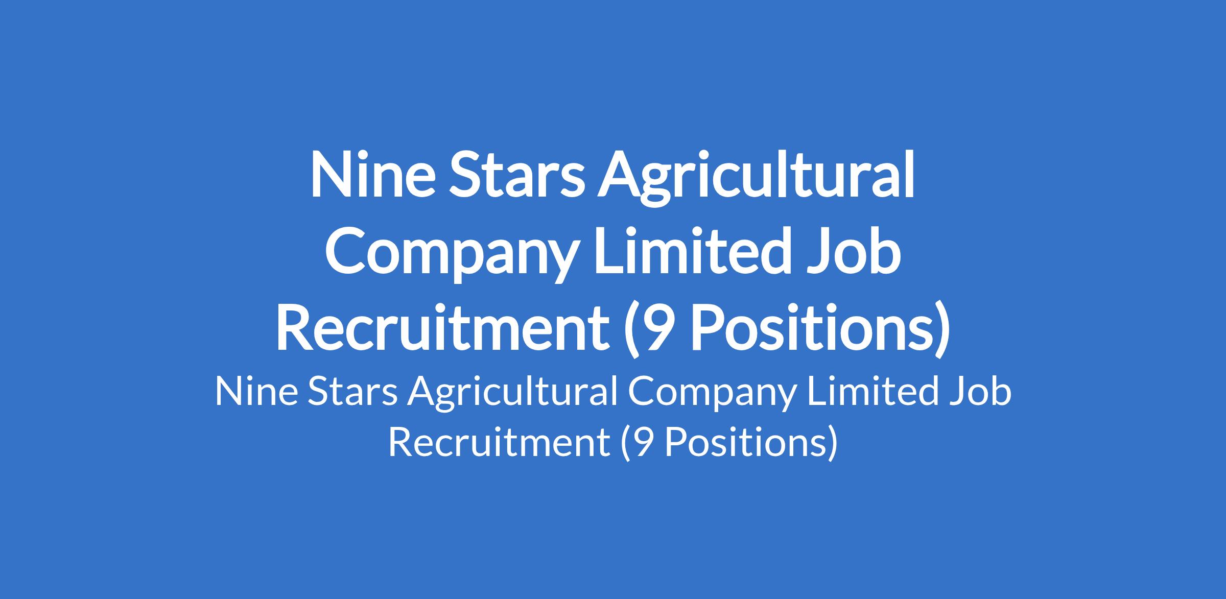 Nine Stars Agricultural Company Limited is recruiting suitably qualified candidates to fill the following positions in Ogun State: Fleet Officer, Land Acquisition Manager, Marketing Manager (Land Acquisition Manager); Senior Land Surveyor; Architectural Engineer; Construction Project Manager; Electrical Engineer; Senior Legal Counsel; and Marketing Manager (Real Estate & Land Acquisition).