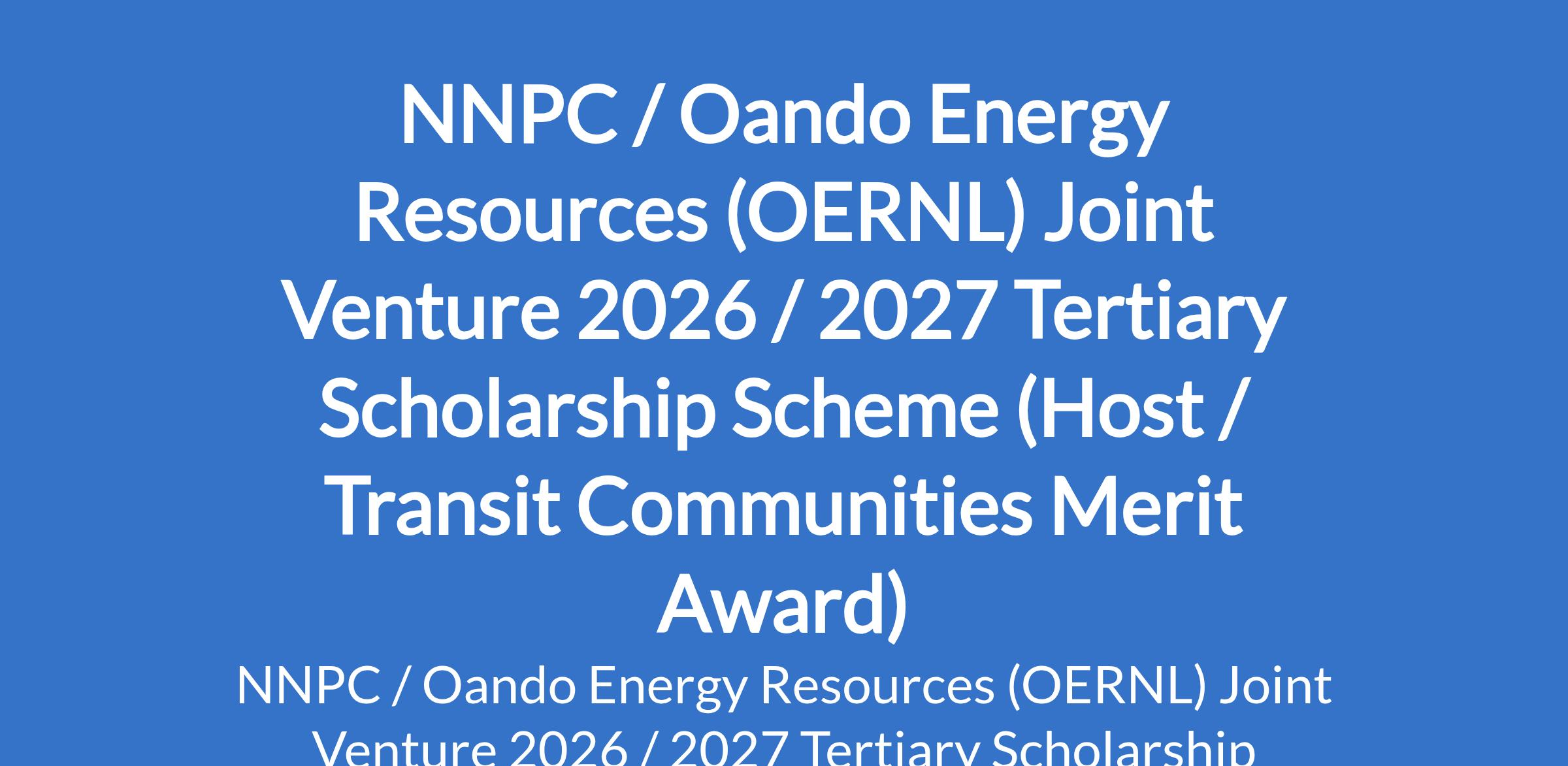 Oando Energy Resources Nigeria Limited (OERNL), operator of NEPL / OERNL joint venture invites applications from suitably qualified candidates for the 2026 / 2027 NEPL / OERNL Joint Venture Tertiary Scholarship Scheme (Host / Transit Communities Merit Award). The scholarship is for registered full-time undergraduates (certified 100 level students) in Nigerian Tertiary Institutions. The award is for applicants strictly from Oando Host / Transit Communities.