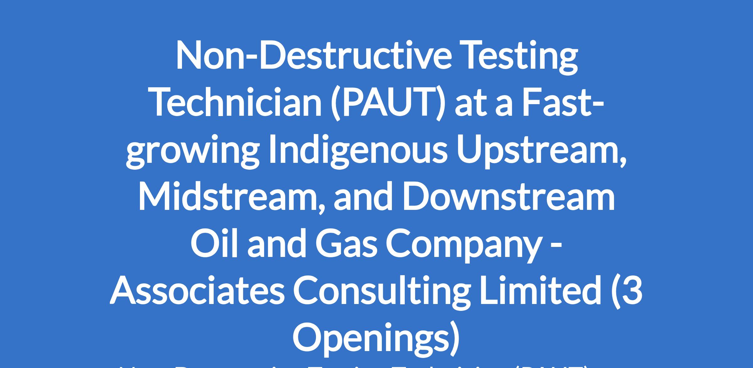 Associates Consulting Limited - Our client is a fast-growing indigenous upstream, midstream, and downstream oil and gas group is recruiting to fill the position of: Non-Destructive Testing Technician (PAUT). The position is located in Akwa Ibom, Delta & Imo States. Interested candidates should possess a Diploma in Engineering with a minimum of 2 years hands-on experience in the PAUT field testing.