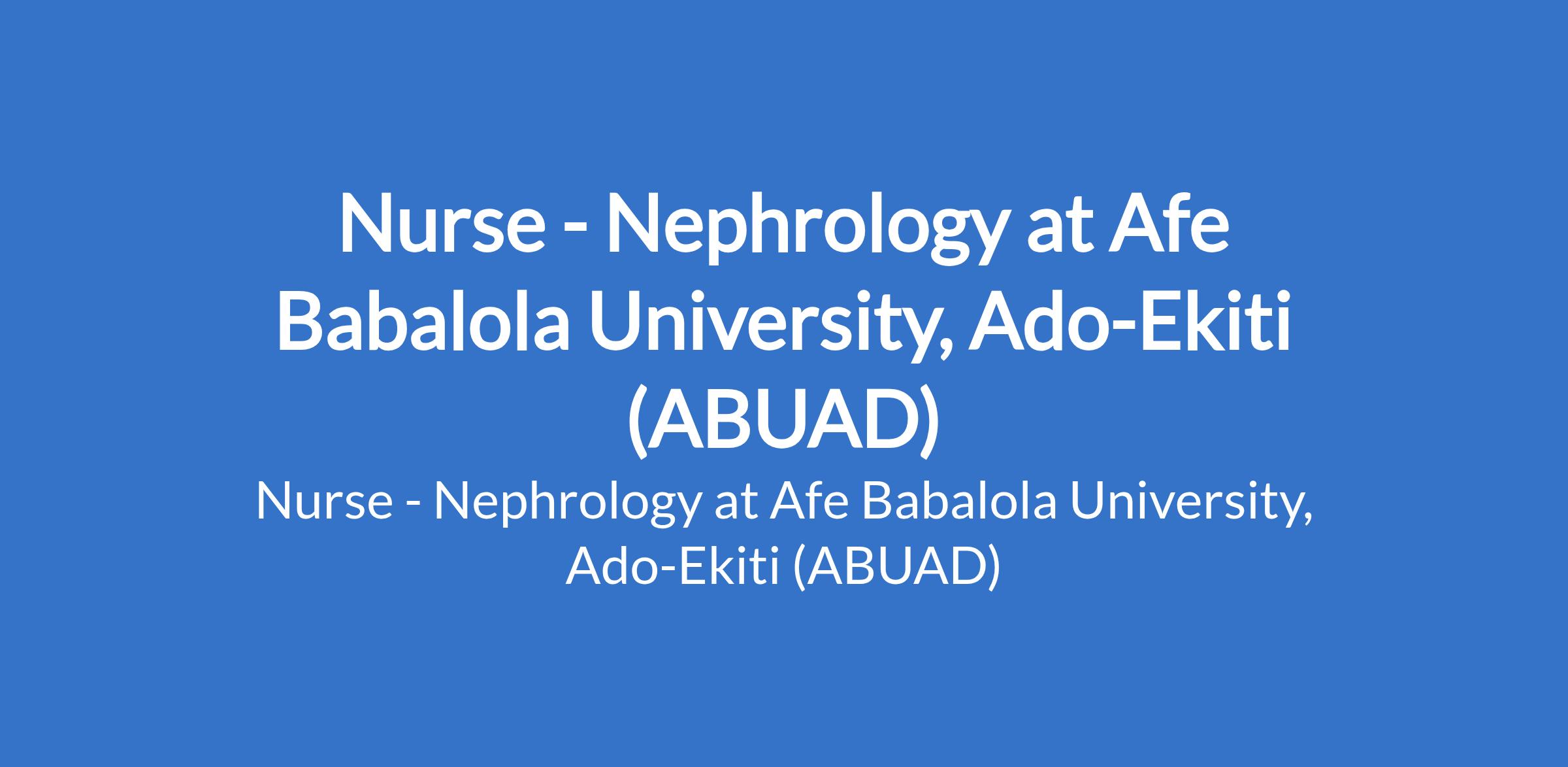 Afe Babalola University, Ado-Ekiti (ABUAD) is recruiting to fill the position of: Nurse - Nephrology. The position is located in Ekiti State. Interested candidates must possess a a Bachelor of Nursing Science (B.NSc.) with not less than Second Class Lower Division.