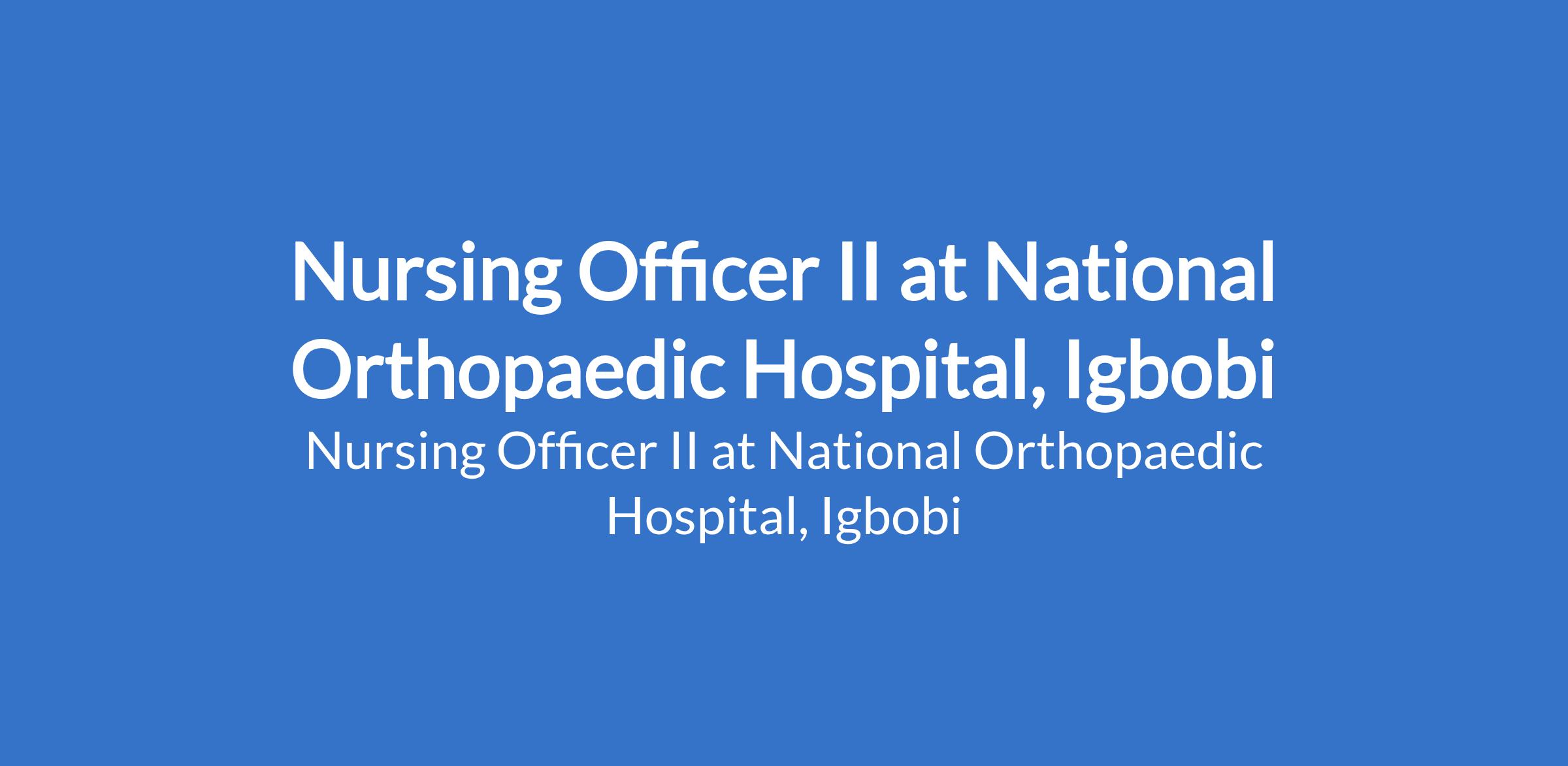National Orthopaedic Hospital, Igbobi invites applications from suitably qualified candidates for the position of: Nursing Officer II. The position is located in Yaba, Lagos State. Interested candidates should possess a registered Nursing (RN) and Registered Midwifery (RM) Certificate and must be registered with the Nursing and Midwifery Council of Nigeria (NMCN); possession of Post Basic Certificate in Accident and Emergency Nursing. Orthopaedic Nursing, Anaesthetic Nursing, Bums & Plastic Nursing, Peri-Op, Nursing, ICU Nursing, Pediatric Nursing or Rehabilitative Nursing from approved institution will be an added advantage.