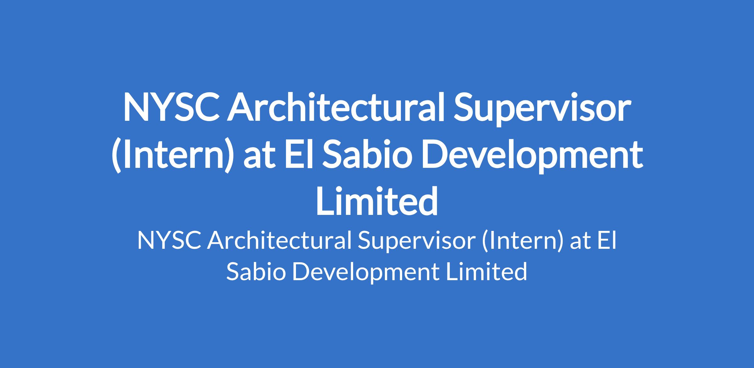 El Sabio Development Limited is recruiting to fill the position of: NYSC Architectural Supervisor (Intern). The position is located in Central Area, Abuja (FCT). Interested candidates should possess a B.Sc. / HND in Architecture; currently serving (NYSC Corps Member) with basic knowledge of AutoCAD or similar software is an advantage.