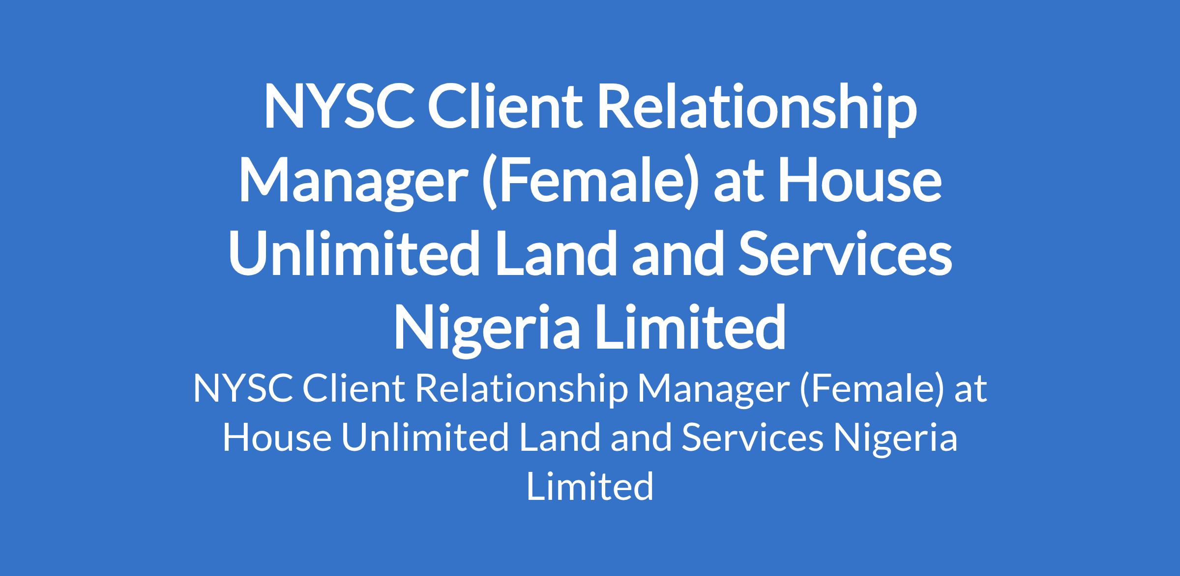 House Unlimited Land and Services Nigeria Limited is recruiting to fill the position of: NYSC Client Relationship Manager (Female). The position is located in Abuja (FCT). Salary: N50,000 monthly. Interested candidates should must be a serving Female NYSC corps member and must reside in Abuja or its environs.