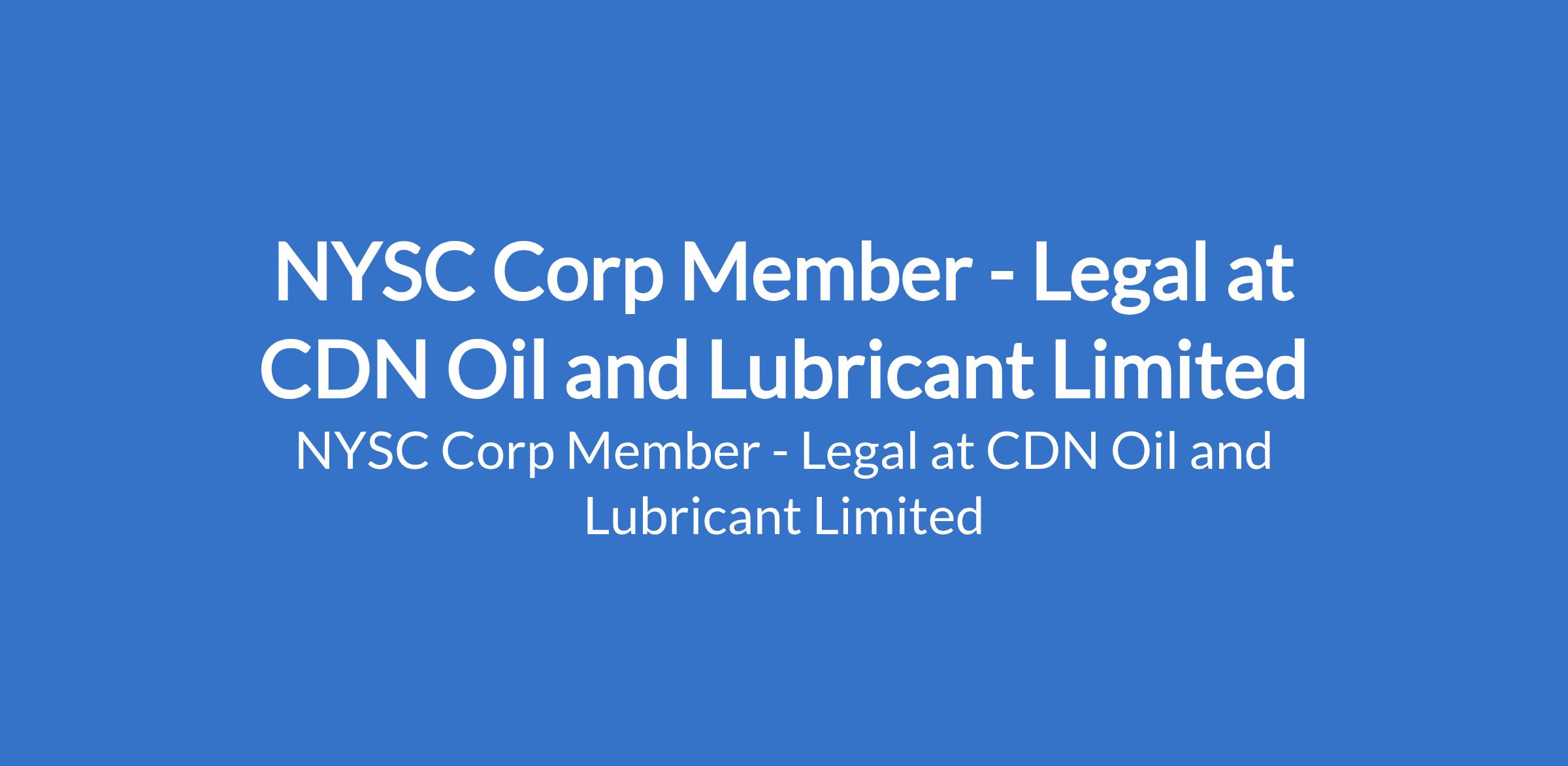 CDN Oil and Lubricant Limited is recruiting to fill the position of: NYSC Corp Member - Legal. The position is located in Abuja. Salary: N50,000 - N100,000 monthly. Interested candidates should possess necessary qualifications in Law and be serving in Abuja.