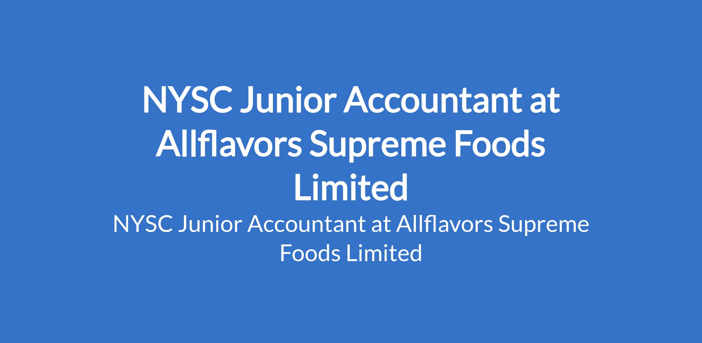 Allflavors Supreme Foods Ltd is recruiting to fill the position of: NYSC Junior Accountant. The position is located in Amuwo Odofin, Lagos State. Interested candidates should possess a Degree in Accounting, Finance, or related discipline with experience.