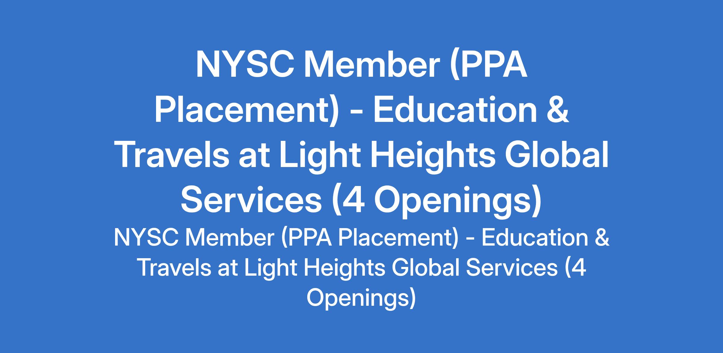 Light Heights Global Services is recruiting to fill the position of: NYSC Member (PPA Placement) - Education & Travels. The position is located in Agidingbi, Ikeja - Lagos State. Salary: N70,000 - N100,000 monthly. The ideal candidate will work closely with experienced professionals, support day-to-day operations, and participate in strategic initiatives. Interested candidates must possess a First Class or Second Class Upper (2.1) Bachelor's Degree from a Federal University and must reside around Agidingbi, Ikeja.